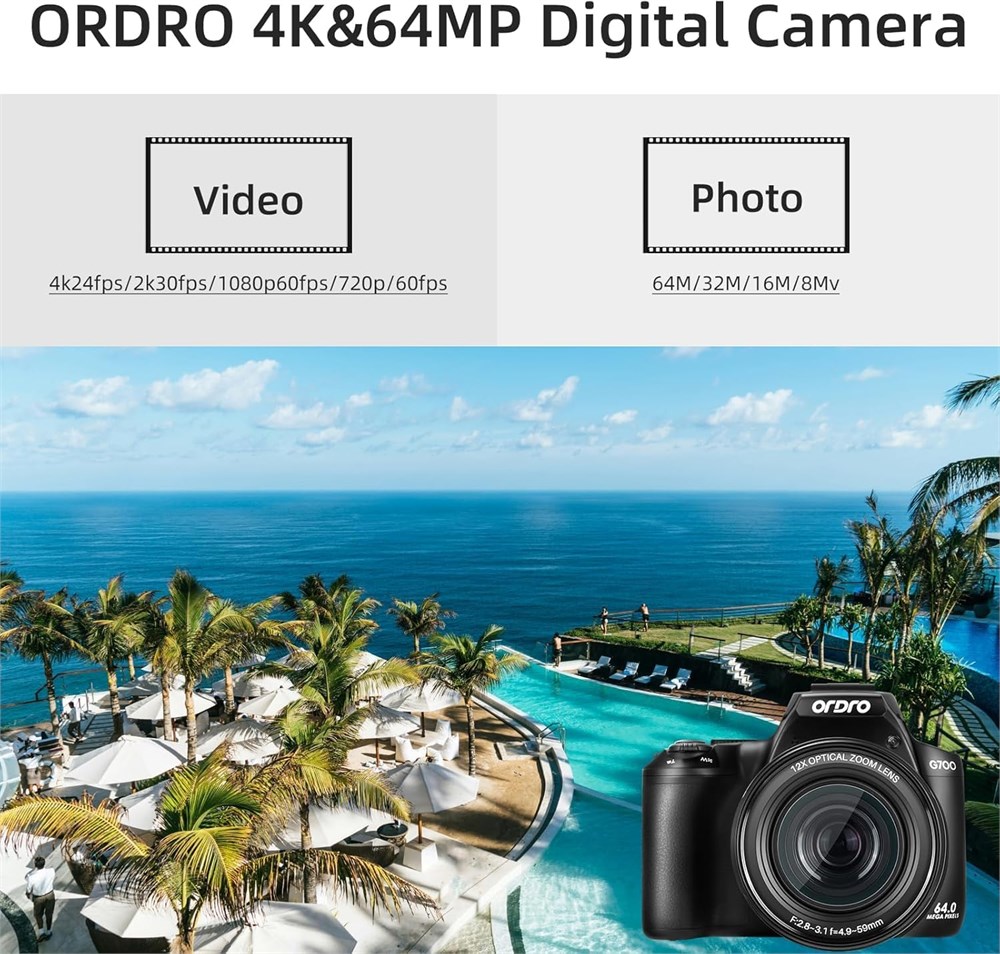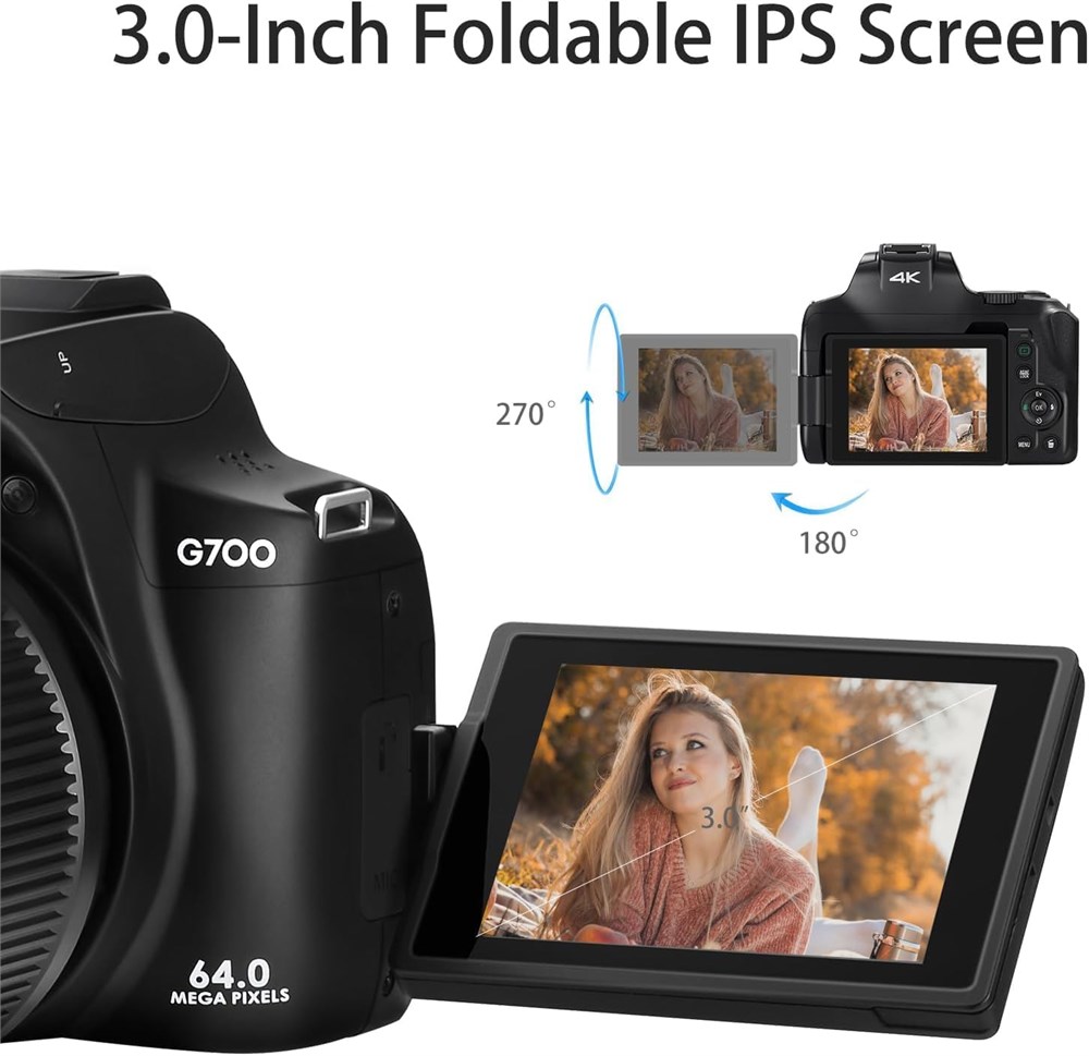 4K High Definition: Make the picture quality more realistic and natural, with every detail clearly visible. High definition shooting brings natural and vivid picture quality, taking you to experience the joy of being there, and richer color layers. Sony sensor: Built in CMOS image sensor can produce clear images even in low light environments. High sensitivity CMOS has powerful image processing capabilities, significantly improving the brightness and detail of the image. 3.0" IPS Touch Screen & Optical Zoom Cameras: Conveniently change parameters or browse videos with the 3.0-inch touch screen. Utilize the 10x Optical Zoom to bring your subjects closer without compromising image quality. Perfect for vlogging and video recording. Auto&Manual-Focus: Quickly lock the camera subject, automatically or manually recognize people and objects, and quickly focus, making the picture stable and the subject clear. What You Get: G700 Camera, Battery, Lens Cover, Type C USB Cable, 64GB SD Card, Lanyard, User Manual.
