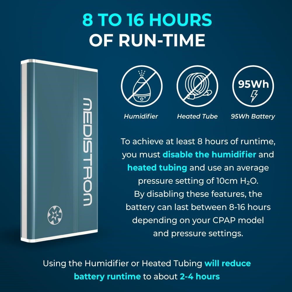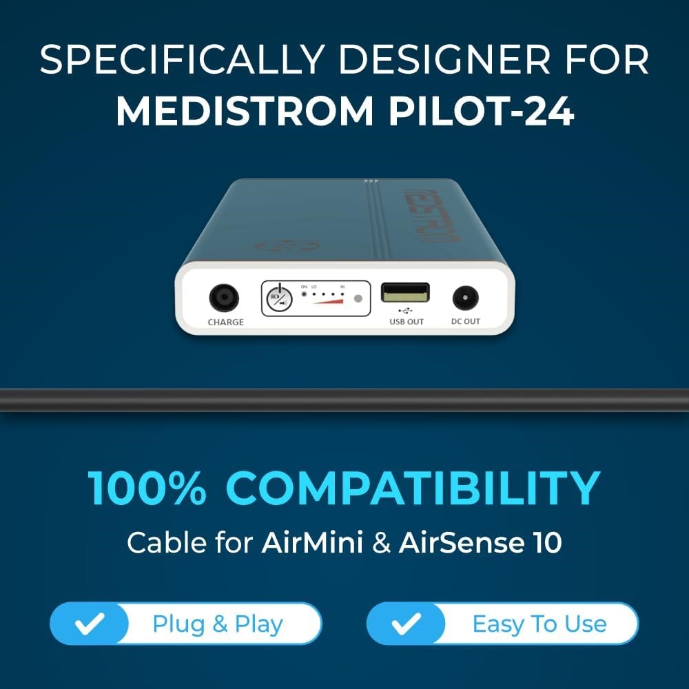 Off-Grid CPAP Power Package includes 2 DC output cables: one for direct connection from Pilot-24 to AirMini, and one from Pilot-24 to AirSense 10. Compact 95Wh battery delivers reliable portable power supply for travel, camping, or emergencies. Additional Compatibility - Pilot-24 Lite works with more 24V CPAP machines, can be used as both a standalone battery and backup power supply. Cables sold separately to power AirSense 11, S9, prismaSMART, Luna, DreamStation Go and iCH CPAP machines. Up to 16 Hours of Runtime Get up to 16 hours of CPAP use on a single charge (actual runtime varies by pressure setting and device model see our chart in product description for full details). Durability & Quality You Can Trust Built with a tough aluminum case and LG industrial-grade cells, the Pilot-24 Lite delivers long-lasting battery power supply perfect for camping, road trips, and outdoor use in rugged environments. Travel Friendly TSA-approved and FAA-compliant at 95Wh (under the 100Wh limit), the 1.3 lbs Pilot-24 Lite is ideal for travel CPAP. Recharges in 2 3 hrs, fits in carry-ons, and powers CPAPs in-flight, at campgrounds, hotels, or anywhere off-grid.