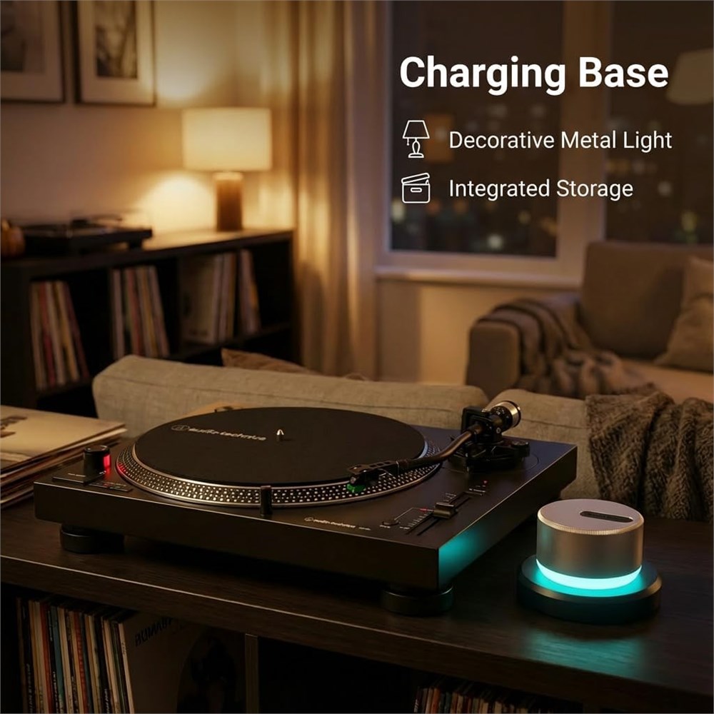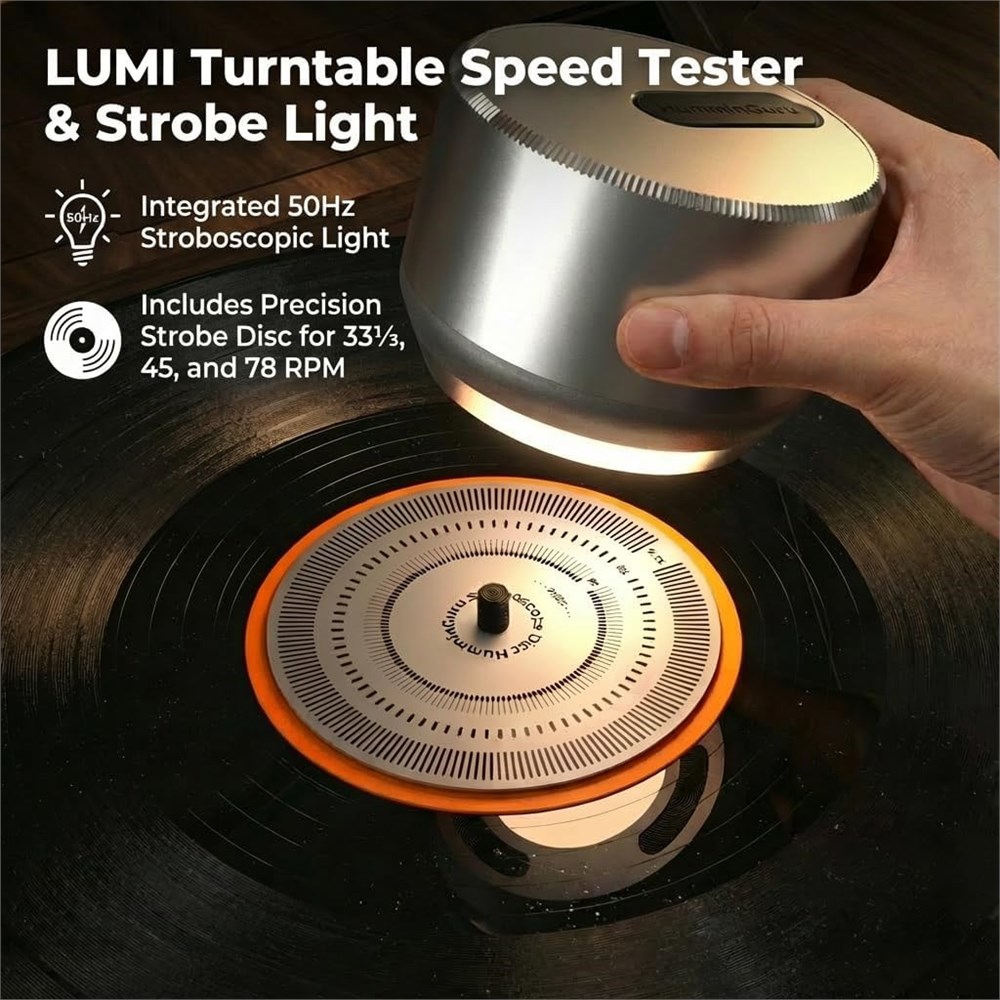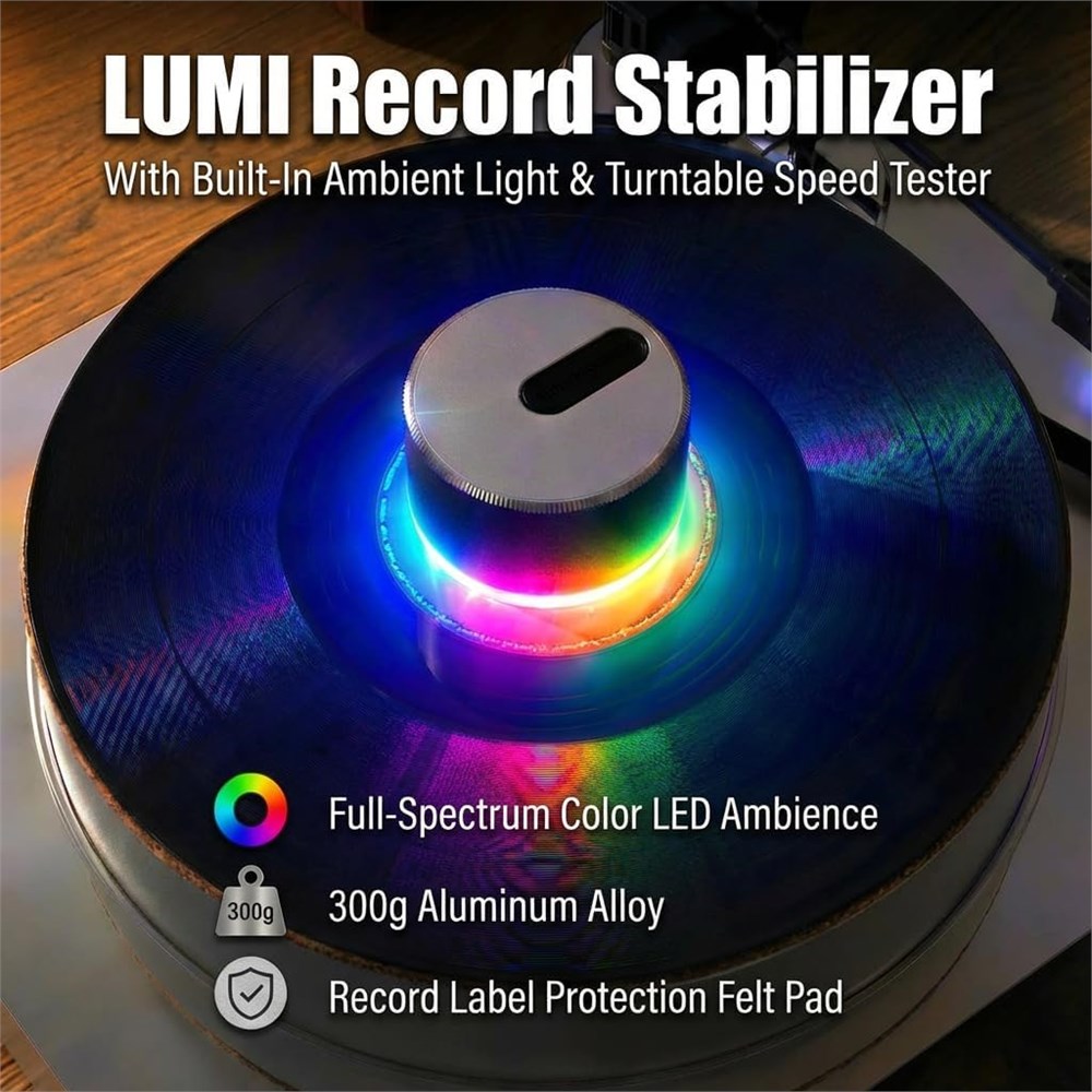 Premium Protection & Luxury Build: This product boasts a proprietary anti-fingerprint non-magnetic aluminum alloy mat finish, an archival-grade felt pad to prevent label discoloration, and a leather power button for tactile elegance. The included charging base with four indicator lights ensures easy storage & charging, and doubles as an ambient light lamp for your record shelf or record player stand. Dynamic 9-Color LED Ambience + Auto Safety: Enjoy mesmerizing color transitions from the 360 LED halo surrounding the stabilizer. It features different lighting modes, automatic color cycling, and a 1-hour auto shut-off for convenience. When docked on its charging base, it creates an elegant display piece for your vinyl space, such as your record shelf and turntable. 300g Precision Stabilization & Warp Correction: Engineered with an optimal 300g (10.6oz) weight to eliminate unwanted resonance and improve tracking on warped records. It works flawlessly with most turntables while minimizing strain on the motor of direct drive & belt drive turntables. All-in-One Speed Tester for 33/45/78 RPM: Verify your turntable s accuracy with the professional built-in strobe light and the included 50Hz stroboscopic disc. Instantly check 33 , 45, and 78 RPM speeds without extra tools. Ultimate Audiophile Gift: A decorative & professional turntable accessory that solves multiple needs stabilization, speed testing, and ambiance. LUMI is the perfect gift for vinyl collectors and audiophiles seeking enhanced sound and style. The ambiance light enriches the joy of music.