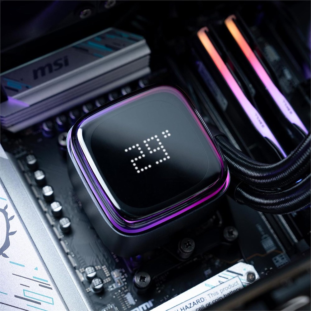 FLOATING VISUAL DESIGN Ocypus Iota liquid CPU cooler flat digital display is elevated through the high-transparency cover, creating an enhanced sense of space, as if suspended within, presenting rich spatial layers REAL-TIME DIGITAL DISPLAY Real-time display of CPU or GPU temperature, with the option to switch between Celsius and Fahrenheit using Ocypus Digital software.(Max display temperature 199 F) SUPERCHARGED ENGINE PUMP 70*70*65mm CPU cooler pump will Efficiently manages liquid cooling circulation, ensuring sustained high-performance output, significantly lowering core temperatures ARGB LIGHTING CONTROL Iota CPU water cooler supporting ARGB independent control, compatible with various motherboard lighting control softwares, easily managing pump lighting effect LOW-NOISE FANS 2 120mm silent fans( 29dB(A)), enhanced with high-quality Fluid Dynamic Bearing.Fan speed 500~2000 10%RPM/ Max airflow 77FCM/Max airpressure 4.65mmH2O,striking a balance between low noise and efficient cooling. SIMPLE INSTALLATION Iota CPU liquid cooler equipped with all-metal mounting hardwares, support for both Intel and AMD mainstream platforms.Compatible with Intel LGA: 115X/1200/1700/1851,AMD: AM4/AM5