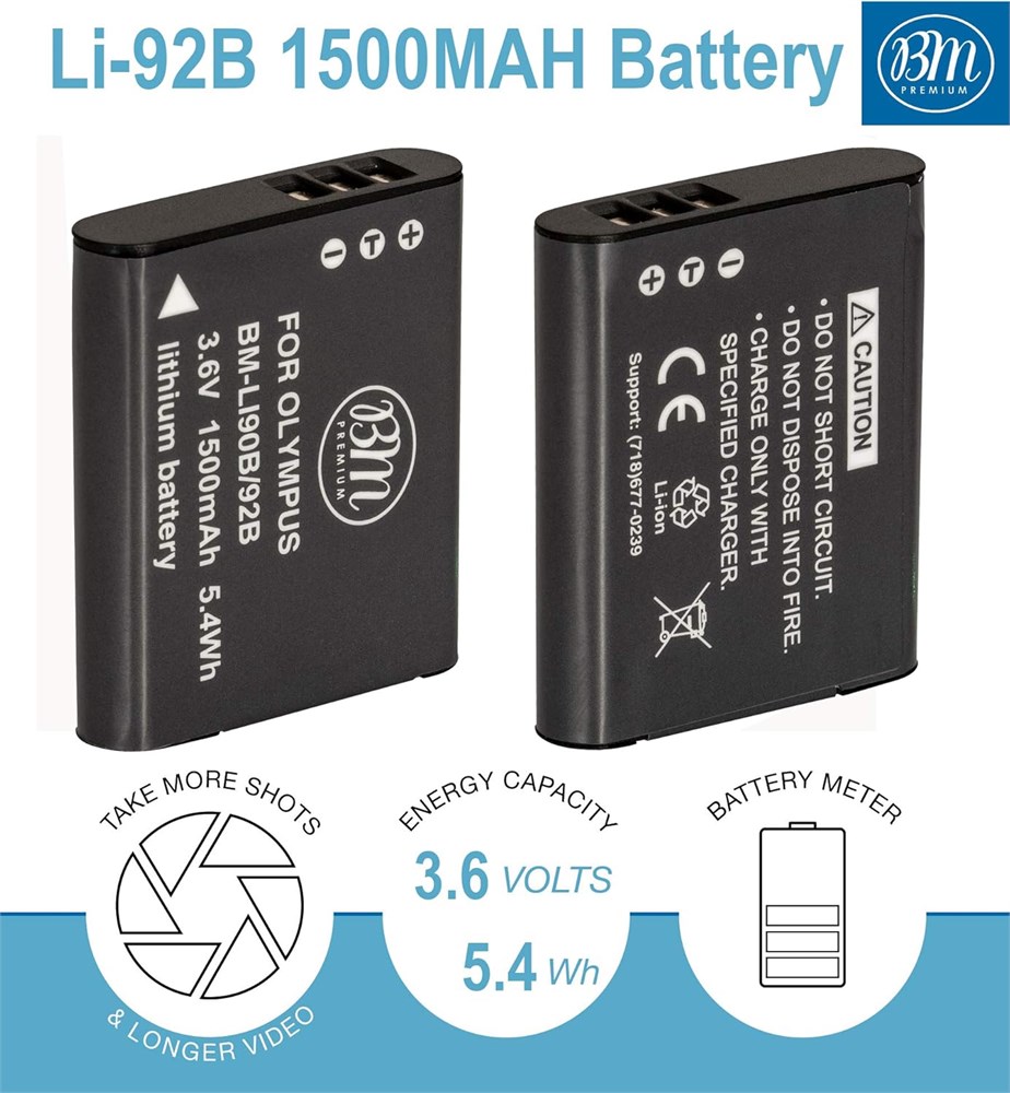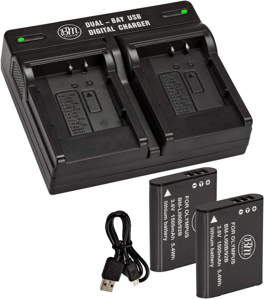 LI-90B LI-92B Li-ion Battery for Olympus Tough Digital Cameras Battery Specifications - Energy Storage Capacity: 1500mAh /Voltage: 3.6 volts, WH: 5.4 Wh - New fully decoded chip works just like the original.(gives time left and does not need a special charger) Memory free for maximum performance - Absolutely no memory effect so that you can charge battery at anytime - Super Long Time Recording - Built with multiple circuit protection (over-charging, short-circuit, high-temperature, and surge protection), and high-quality, fire-resistant construction Convenient Charging Method: Common micro-USB input and the ability to charge with a USB wall charger, car charger, or external battery gives you more options than a standard battery charger, and Charges 1, or 2 LI-92B batteries simultaneously and smart LED light turns to red when charging and green when complete. (Adapters and Power bank sold Separately) Dual Bay USB Charger charges 1 or 2 batteries simultaneously from any USB power source. It is built with multiple circuit protection (over-charging, short-circuit, high-temperature, and surge protection), and high-quality, fire-resistant construction.