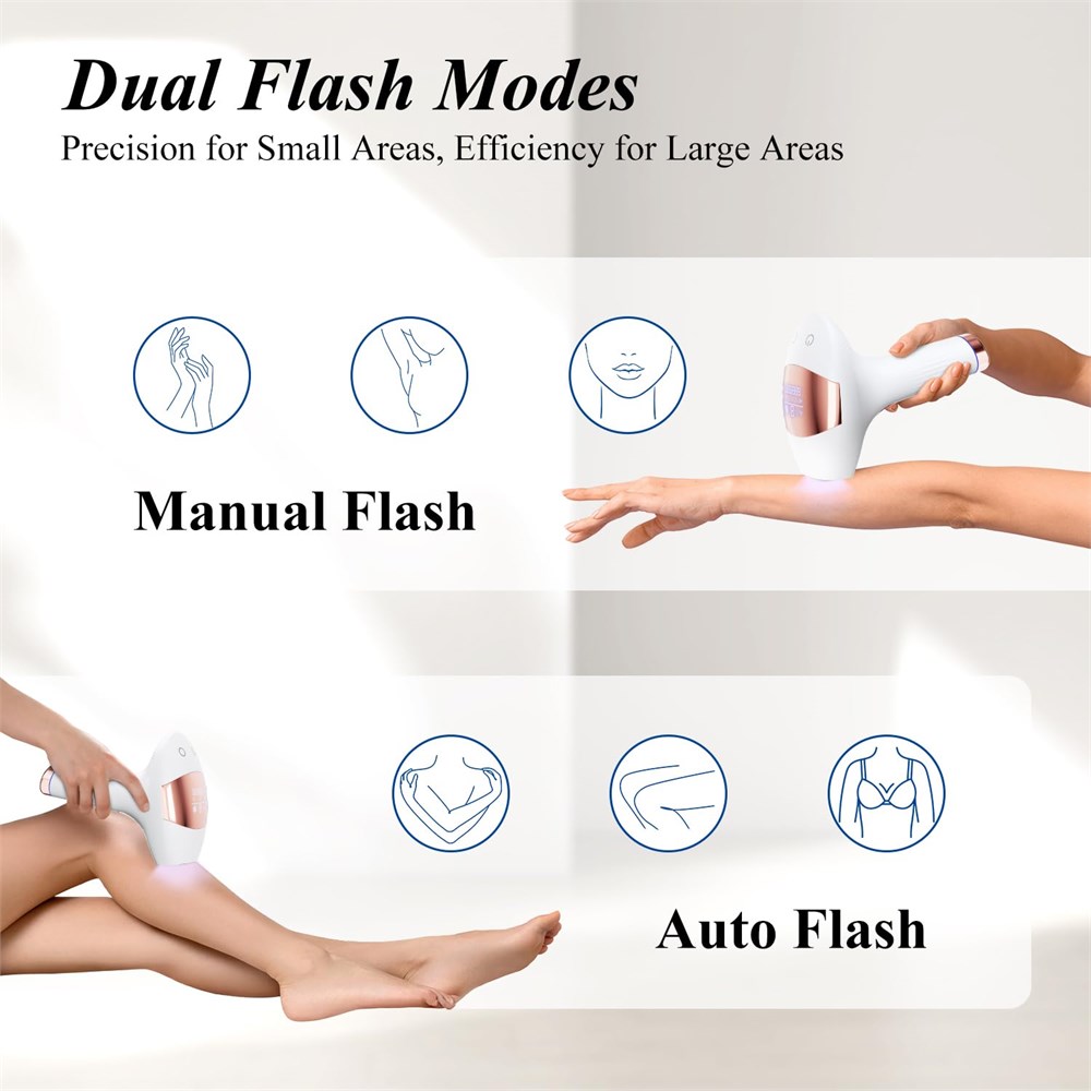 Advanced IPL Technology The Xsoul hair removal device utilizes state-of-the-art Intense Pulsed Light (IPL) technology, emitting a red light spectrum between 470 nm and 1200 nm. This wavelength range allows deep penetration into hair follicles, disrupting the growth cycle for more efficient and complete hair removal. Salon-like results can be achieved with a high reduction rate after just six weeks of consistent use. Cooling for Comfort Equipped with an enhanced ice-cooling mechanism, the device instantly soothes the skin after each flash, keeping the surface temperature at a comfortable 50 F. This minimizes heat sensation, prevents redness, and ensures a gentle, pain-free experience. Personalized Power Settings Featuring 9 adjustable energy levels, the device allows you to tailor treatments to your specific needs. Delivering up to 19J of uniformly distributed energy, it adapts to various skin types and treatment zones higher intensities provide stronger results. It is recommended to begin at level 1 and gradually increase based on skin tolerance. Dual Treatment Modes Designed for versatility, the device offers both automatic and manual operation modes to match different body areas and hair growth patterns. Manual mode is perfect for precision on smaller zones like the face, underarms, or bikini line, while auto mode efficiently covers broader areas such as legs, arms, and the back. The upgraded model also includes three built-in skincare functions to nourish skin during treatment. Safety Guidelines Avoid using the device directly over tattoos or on very dark or deep brown skin tones, as excessive light absorption may cause discomfort. Do not hold the device in one spot for prolonged periods or flash repeatedly on the same area. For safe and optimal results, please review the user manual thoroughly before operation.