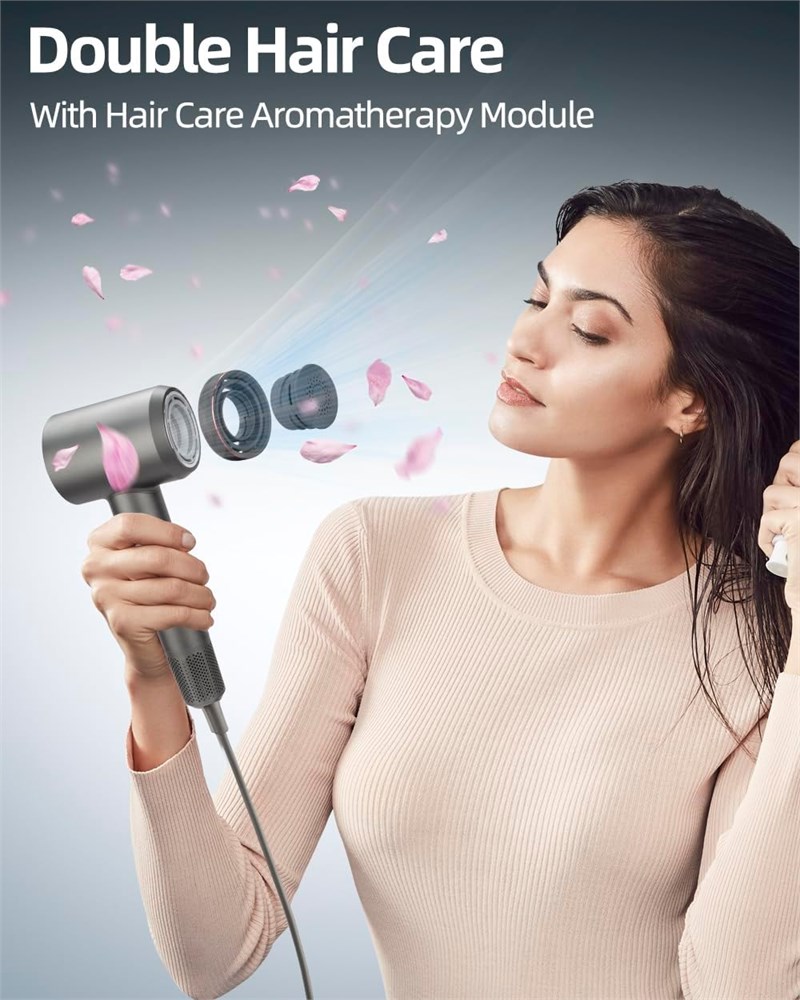 Hair dryer with diffuser and aromatherapy module: Professional hair dryer with magnetic hair care aromatherapy nozzle and diffuser ,after use leaves hair fluffy, soft and shiny, and smoothes frizz, improves strength, and comes,It's also accompanied by a lingering scent maintain a flawless hairstyle and gives off a light fragrance wherever you are. High Speed hair dryer: hairdryer is adopt a -130,000 RPM high-speed brushless motor ,wind speed reaches 36m/s,which can quickly dry your hair in 3-8 minutes,Save 70% more Time than Traditional. Multi stage intelligent temperature control system: hair dryer using flame-retardant materials to eliminate the odor generated by heating,high-speed motor ensures strong and stable airflow, ensuring the service life of the product. The Nudwis blow dryer uses 4-stage LED lights to display temperature and is matched with high-performance intelligent sensors to measure air temperature more than 400 times per second, avoiding overheating and protecting hair. 500 million Negative Ion Technology: The ions hair dryer generates 500 million negative ions during the drying process, balancing the static electricity in the hair. it keeps hair silky and effectively locks in moisture, making hair soft, silky, keeping it fresh. Low noise and safe: this hair dryers for women uses damping and noise reducing materials, with a noise level of only 65dB and will not disturb family members. blowdryer has an overheat protection function, which refuses to bake hair at high temperatures, protects hair from injury, and ensures a more pleasant drying experience. Exquisite and portable this Nudwis travel hair dryer can meet the needs of different usage scenarios such as women, man,children, pets, etc. hair dryer is lightweight and portable, suitable for , family, salons and travel blow dryer,Perfect as a gift for family and friends.