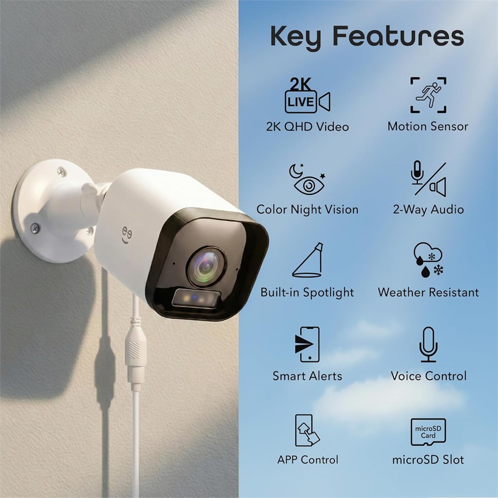 Clart Ultra HD 4MP : profitez d'une surveillance sup rieure avec une r solution de 4 MP (2560 x 1440) qui offre une nettet 2K et des visuels clairs de jour comme de nuit. Vision nocturne aux couleurs vives : l' clairage LED int gr capture des vid os en couleur la nuit, offrant une vue longue port e de 30 m tres qui d passe de loin les cam ras infrarouges noires et blanches standard. D tection intelligente avanc e : recevez des notifications instantan es pour les alertes de mouvement et personnalisez les zones de d tection pour vous concentrer sur les zones hautement prioritaires comme les all es ou les entr es. Talk bidirectionnel en temps r el : utilisez le microphone et le haut-parleur int gr s pour parler avec les visiteurs, coordonner les livraisons ou dissuader les intrus directement depuis votre smartphone via l'application Geeni IP65 r sistant aux intemp ries et stockage local : con u pour r sister aux conditions ext rieures extr mes de -20 50 ; s curisez vos enregistrements localement l'aide d'une carte microSD jusqu' 256 Go (vendue s par ment).
