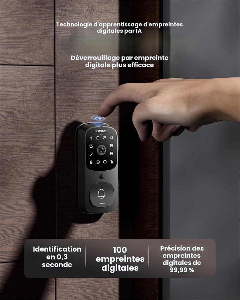Syst me de s curit avanc 6-en-1 Int gre une serrure de porte d'entr e sans cl , une cam ra HD 2K avec vision nocturne et une sonnette vid o intelligente le tout dans un design l gant. Les deux capteurs de mouvement d tectent les mouvements jusqu' 6 m tres, envoyant des alertes instantan es. 6 m thodes de d verrouillage : serrure de porte intelligente via reconnaissance d'empreintes digitales AI, codes de clavier, voix Alexa/Google, application ou cl s de sauvegarde. Stocke 50 empreintes digitales pour le partage familial (veuillez vous assurer que votre doigt et le verrou intelligent ne sont pas mouill s) Vid o 2K et audio bidirectionnel : les verrous intelligents pour porte d'entr e offrent un objectif grand angle de 180 pour capturer des s quences ultra HD. L'audio bidirectionnel vous permet d'accueillir les visiteurs distance via l'application, de jour comme de nuit. D tection humaine intelligente La serrure intelligente avec capteurs Radar + PIR avanc s distingue les personnes des objets. Enregistre automatiquement des vid os crypt es de 15s sur votre t l phone lors de l'activation. T l commande par application Les serrures intelligentes WiFi p ne dormant prennent en charge le contr le d'acc s, surveillent les entr es via l'application (WiFi 2,4 GHz requis). Batterie de 6 mois et r sistante aux intemp ries : la batterie de 10 000 mAh dure 180 jours par charge. Protection IP65 contre la poussi re, la pluie et les temp ratures extr mes. Installation rapide + excellent soutien : s'adapte aux portes standard US/CA (installation en 15 min). Couvert par une garantie de 12 mois et une quipe client d di e.