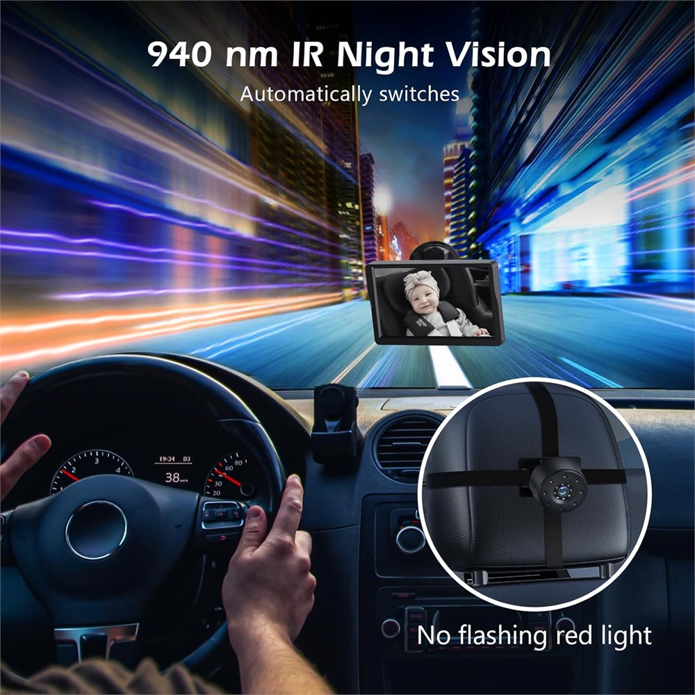 7inch FHD Display The 7-inch Car Mirror IPS display provides clear visuals with 1080p HD resolution. Equipped with the latest upgraded chip technology, it ensures fast, accurate information transmission with no delay. Whether on a long-distance trip or your daily commute, you can enjoy quality time with your baby more comfortably while ensuring the safety of your entire family. Easy Installation in 3 Minutes: No tools are needed to install the stroller backseat camera with baby car monitor. Simply secure the stroller backseat camera to the headrest, connect the video cable to the monitor on the dashboard, and plug it into the 12V cigarette lighter. This 12V power source is compatible with most cars, trucks, vans, and SUVs (USB is not supported) we also comes with cable ties, making it easy to organize the wires for installation in the car. Wide Viewing Angle & Adjustable Position: The Rear Facing Camera has a 178 wide-angle lens, offering a full view of your baby, ensuring they are always in sight without any distortion. The Car Seat Camera also rotates 360 , allowing you to adjust the angle for a clear view of your child, no matter their seat position. Upgraded Night Vision Function: Baby Car Camera uses 940nm infrared night vision technology to provide clear images in both bright and low-light conditions. It automatically switches to night vision based on ambient light levels, so even when driving at night, you won t need to turn on interior lights and disturb your baby. Car Baby Monitor Multiple Placement: The Car Baby Monitor has a strong suction cup, providing excellent stability. It can be reinstalled on the center console or windshield. Choose the installation method that best suits your preferences and needs to better observe your baby and enjoy a smoother driving experience.