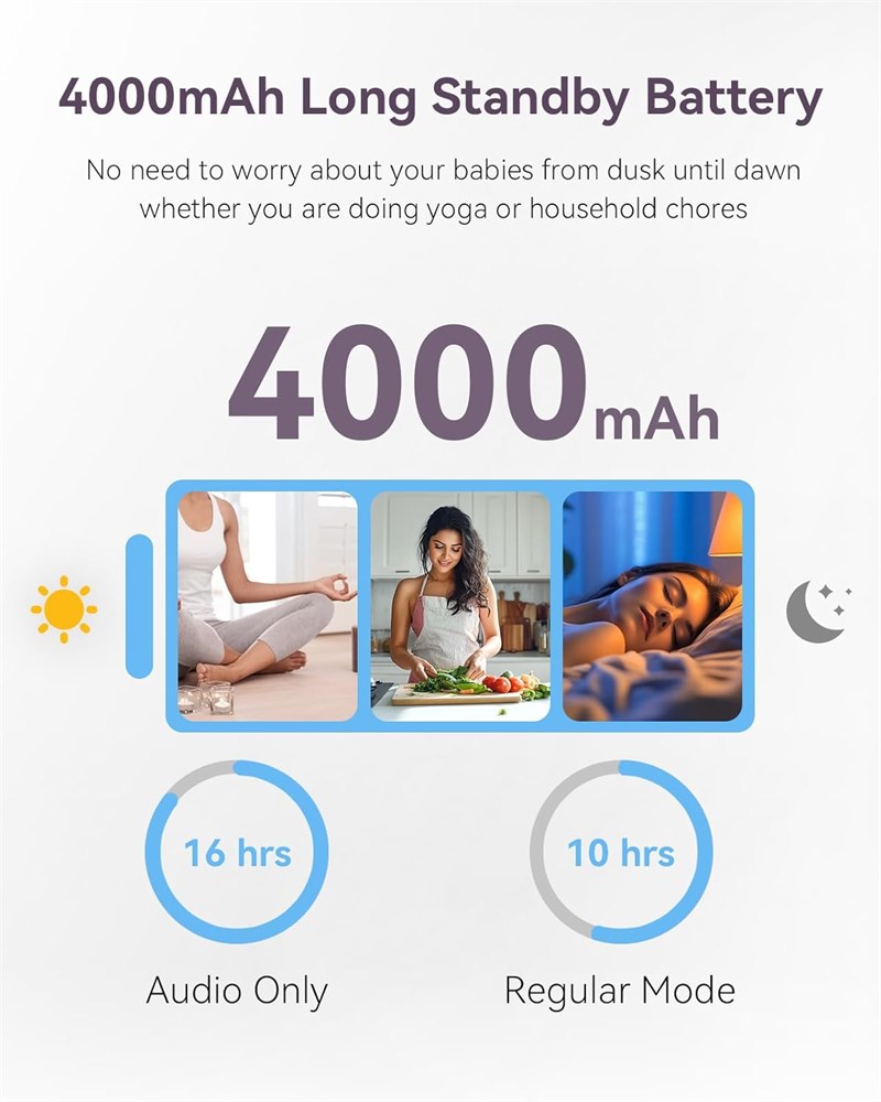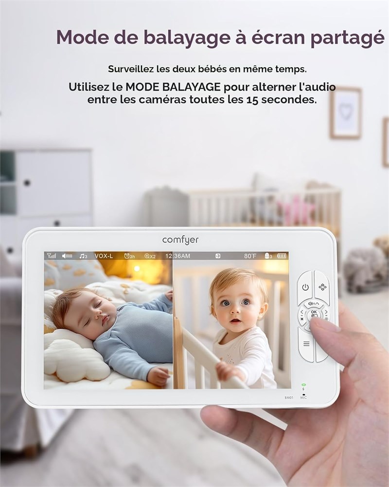 Prenez soin de deux b b s avec cran partag : le moniteur de b b Comfyer avec 2 cam ras super claires 1080p vous permet de garder un il sur les deux b b s la fois sur un seul cran HD 720p de 7", tandis que la mise au point audio reste sur une cam ra la fois, assurant une coute claire et ininterrompue. De plus, avec le mode SCAN, alternez sans effort l'audio entre les cam ras toutes les 15 secondes, vous assurant de ne jamais manquer un moment de l'une ou l'autre cam ra. Vous pouvez connecter jusqu' 4 cam ras la m me unit d'affichage. Grand cran couleur de 7" et t l commande panoramique et inclinaison 355 : profitez d'un grand cran de 7 pouces sur ce moniteur de cam ra pour b b . La cam ra t l command e pivote 355 l'horizontale et 120 verticale vous offre une vue plus large de la chambre de votre b b . La fonction zoom x4 garantit des visuels clairs. Rotation silencieuse de la cam ra pour un environnement paisible. Vision nocturne infrarouge et surveillance audio vid o bidirectionnelle pour b b : la technologie de vision nocturne am lior e vous offre une vue claire de votre tout-petit pendant qu'il fait la sieste, m me dans des conditions de faible luminosit . Parfois, tout ce dont votre b b a besoin est d'entendre le son de votre voix. R confortez votre b b depuis n'importe quelle pi ce avec l'interphone int gr sur l'unit parentale portable. Avec une tag re flexible pour appareil photo : nous avons soigneusement quip un support de cam ra pour moniteur. Ce support de moniteur pour b b se fixe aux tag res du berceau, l'int rieur sans outils ni dommages muraux. Il vous suffit de plier et de faire pivoter le col de cygne flexible qui s'enroule autour du berceau, du lit, de l' tag re, du rebord de fen tre ou d'autres meubles, de sorte que vous aurez toujours une vue parfaite de votre enfant endormi. Sonorit apaisante et capteur de temp rature : cr ez et surveillez un environnement confortable et agr able pour vos b b s avec la bonne temp rature et des sons naturels/berceuses pour apaiser les sens. Le capteur de temp rature vous rappellera de r gler le thermostat si n cessaire selon vos param tres. Cinq m lodies apaisantes et trois sons ambiants doux pour aider votre b b glisser dans un doux sommeil. Jusqu' 17 heures. Streaming vid o ou 30 heures en mode audio sur une seule charge : avec une batterie rechargeable de 4000 mAh, vous pouvez obtenir jusqu' 17 heures de streaming vid o ou jusqu' 30 heures d'audio uniquement, vous permettant de surveiller facilement votre b b tout au long de la nuit ou toute la journ e sur une seule charge. Facile installer et moniteur de b b s r sans Wi-Fi : il s'agit d'un moniteur vid o pour b b non wifi. Adoptant la technologie avanc e FHSS 2,4 GHz et le cryptage num rique. Les donn es transmises entre l'appareil photo et le moniteur sont si rapides, et vous n'avez pas besoin de vous soucier des risques de piratage. Croyez-moi, votre b b est en s curit . Contr le VOX, cran automatique et indicateurs sonores : pour vous reposer pendant que le b b dort, vous pouvez teindre l' cran du moniteur et couper le son aussi. Soyez assur que lorsqu'il est teint, il surveille toujours le b b en arri re-plan. Lorsqu'il capte un son sur vos param tres VOX, l' cran se rallume automatiquement. Contenu : 2 unit s parentales, 1 cran, 1 support en silicone ( l'heure actuelle, seuls nous sommes quip s sur le march , mais cet accessoire n'est pas inclus dans le kit de lentille unique), 1 adaptateur d'alimentation CA, 1 cale de montage mural, 1 jeu de vis, 1 manuel de l'utilisateur (fran ais non garanti)