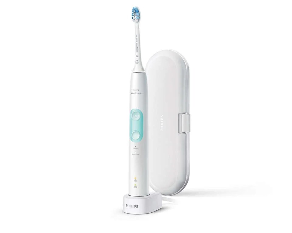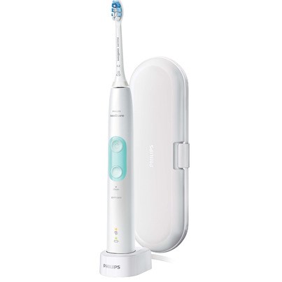 Feel the difference of a gentle clean of a ProtectiveClean 4500 with Philip's Pressure Sensor while improving your gum health up to 100% more vs. a manual toothbrush. Whether you want to focus on removing plaque or on getting your gums healthy and keeping them that way, this brush has a mode for you: Clean mode delivers superior cleaning, while Gum Care mode adds an extra minute of reduced-power brushing, so you can gently massage your gums. BrushSync technology tracks how long you have been using your brush head and how hard you have been brushing. It will beep to inform you when to replace your brush head. The easy-start feature slowly increases the power of the brush as you get used to the Sonicare experience and the smartimer encourages a full 2 minutes brushing time as recommended by your dental professional. The battery charge indicator light lets you know when it is time recharge; 2 week battery life. The kit includes: 1 Philips Sonicare ProtectiveClean 4500 electric toothbrush, 1 Optimal Gum Care brush head and 1 charger.Features: Pressure sensor protects teeth and gums from excess brushing pressure Always know when to replace your brush head for an effective clean with BrushSync replacement reminder2 Intensity settings for maximum comfortBattery charge indicator light let's you know when to recharge; 2 week battery life.