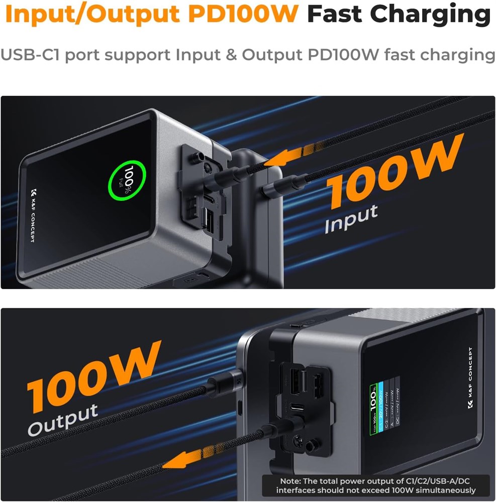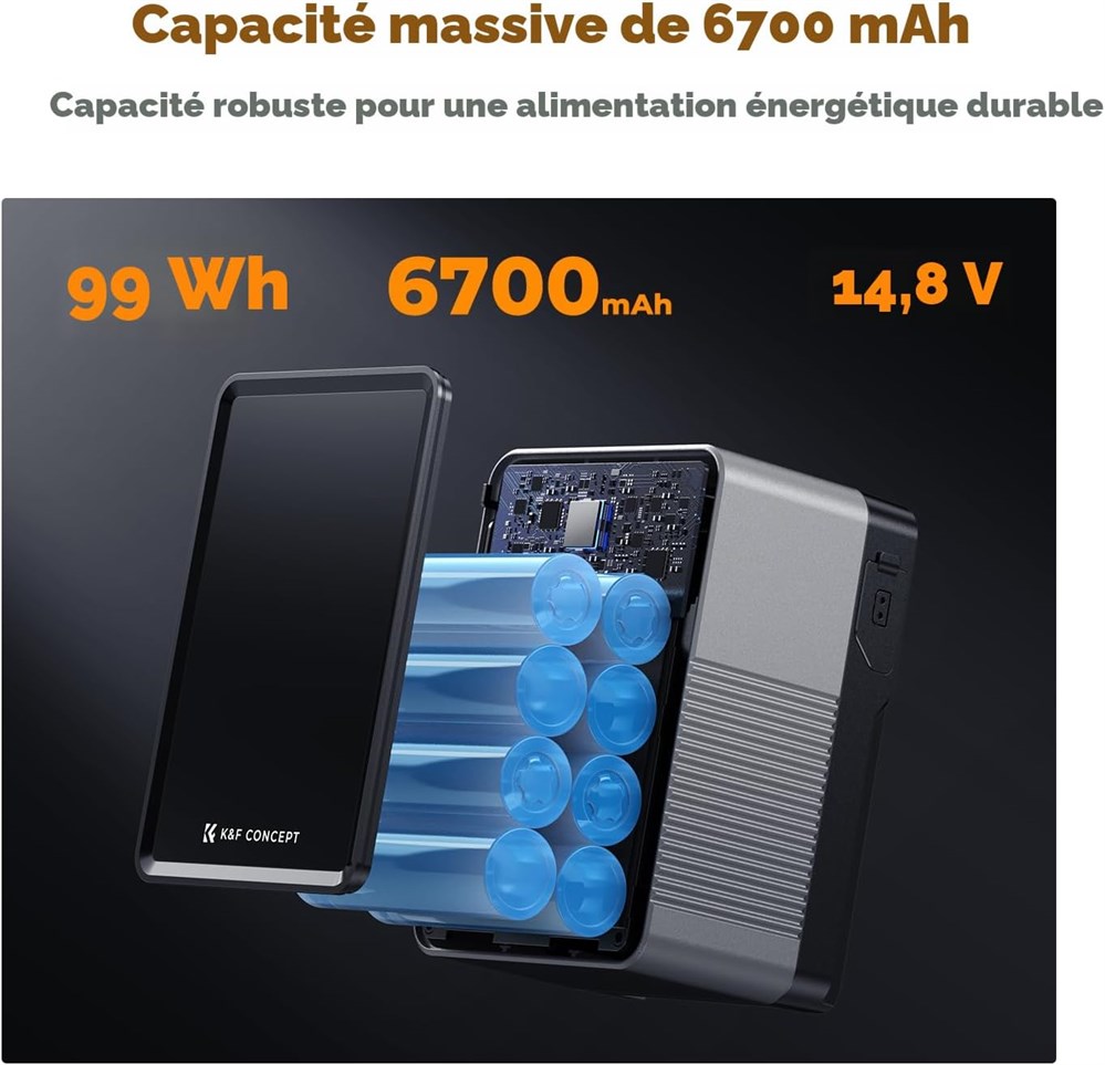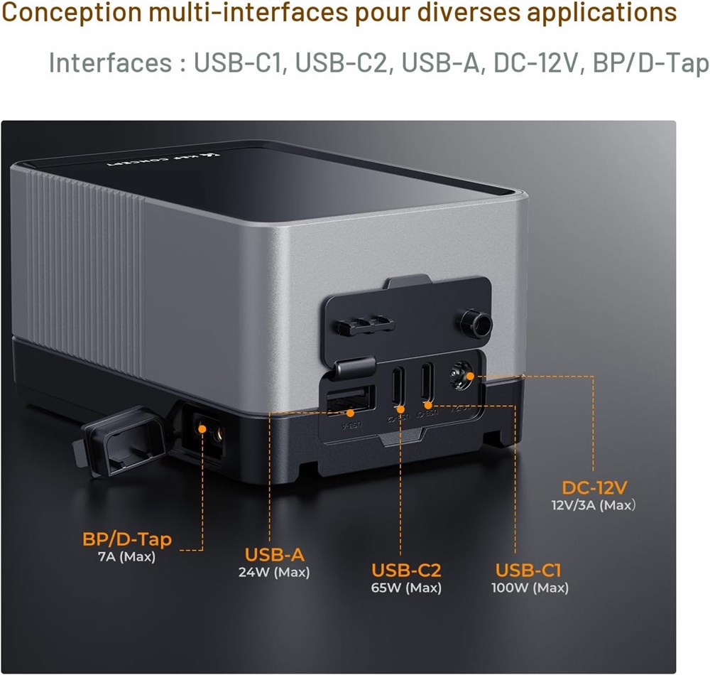 Charge rapide bidirectionnelle PD 100W am lior e : Prend en charge plusieurs protocoles de charge rapide (PD3.0, QC2.0, QC3.0, PPS, APPLE-2.4A, etc.) Le port USB-C se charge compl tement en 2,5 heures ; alimente les cam ras, les moniteurs, les smartphones, les tablettes et les ordinateurs portables Interfaces multiples : comprend deux ports USB-C, un port USB-A, un port DC 12V, BP et D-TAP pour la charge simultan e des appareils. Dispose d'une veilleuse d'urgence pour une fixation facile dans les environnements sombres Haute capacit : capacit de 99 Wh (6700 mAh) avec des cellules de batterie de haute qualit ; plus de cycles de charge et une autonomie de batterie plus longue pour des s ances vid o et des projets photographiques prolong s cran TFT en temps r el : l' cran couleur TFT affiche la puissance de sortie pour chaque port et l' tat de la batterie en temps r el, assurant une gestion efficace de l'alimentation Portable et approuv pour les compagnies a riennes : Compact (108 x 76,5 x 57,5 mm, 630 g) et convient pour les bagages main ; batterie lithium (6700 mAh / 14,8 V / 99 Wh) approuv e par les compagnies a riennes.