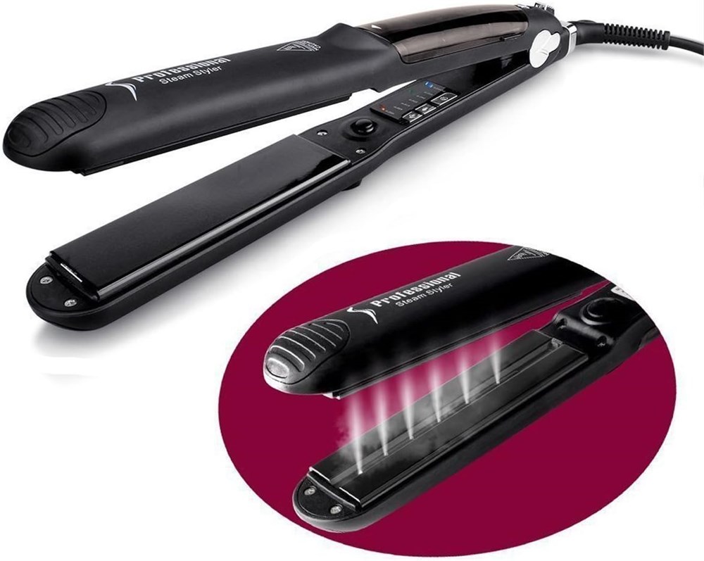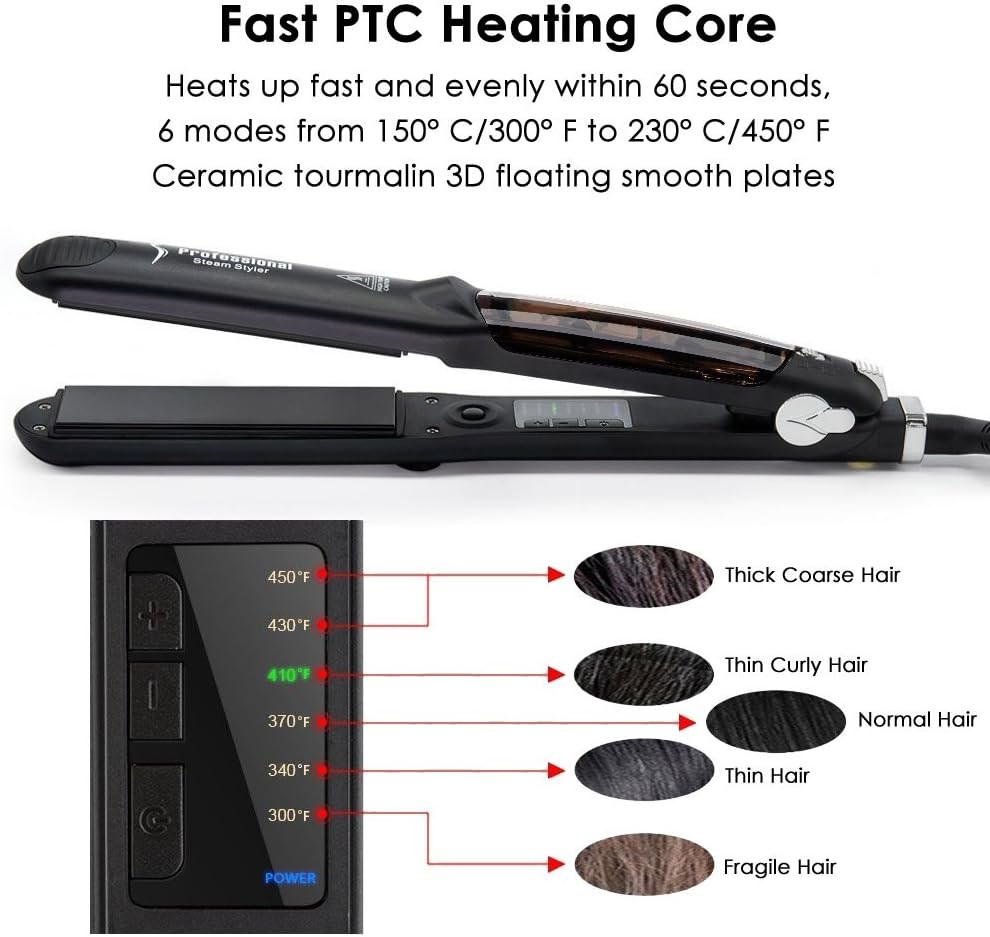 Technologie vapeur : con ue avec une nouvelle fonction vapeur, 5 a rations de vapeur conditionn es sur la plaque chauffante mettent de la vapeur chaude pour ajouter de l'humidit et de la brillance aux cheveux, rendant vos cheveux plus sains et r duisant les dommages caus s par la vapeur. Plaques de tourmaline en c ramique ionis e : plaques infus es de tourmaline en c ramique de 3,2 cm de large avec ions n gatifs pour liminer l' lectricit statique des cheveux pour une finition brillante, noyau chauffant PTC stable et rapide, chauffe les plaques en une minute. Utilisation bidirectionnelle : bord arrondi et design incurv , adapt pour le lissage et le bouclage 2 en 1. Bouton vapeur OFF/MED/HIGH, peut tre utilis comme fer plat ordinaire ou fer vapeur Temp rature r glable : affichage LED avec 6 modes de temp rature diff rents de 150 235 pour diff rents besoins de cheveux. Conception de s curit : arr t automatique de 60 minutes, cordon d'alimentation sans enchev trement 360 , double tension mondiale, plaques de verrouillage pour le stockage et les voyages, mat riau et design anti-calcaire.