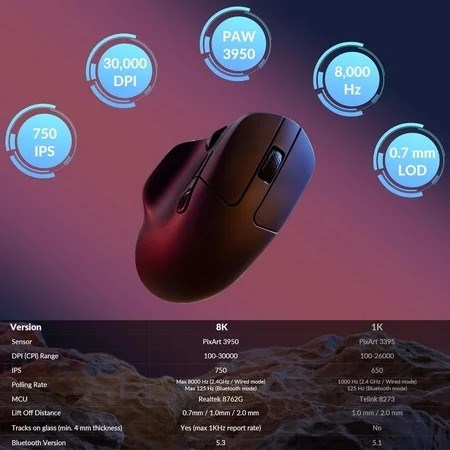 Ergonomic Comfort for All-Day Use - The ergonomic design of M7, featuring a smooth curve on the top and a thumb rest on the side, conforms more closely to the contour of your palm, ensuring a comfortable grip over extended periods. Flexible Connection Options - Connect your way with 2.4 GHz wireless, Bluetooth, or USB Type-C wired mode. Whether you're minimizing latency or maximizing convenience, the M7 adapts to every setup. 8kHz Polling Rate - It means a more responsive cursor movement captured with faster trigger response on 2.4G and wired modes, with up to 40 hrs 2.4G mode working time (Up to 120 hrs at 1kHz polling rate). Precision at Every Level - Powered by the PixArt PAW3950 sensor, the M7 delivers ultra-responsive tracking on virtually any surface even glass (1kHz mode). Packed with tech and adjustable through an online web app with up to 30,000 DPI, 750 IPS, and an 8000 Hz polling rate. macOS & Windows Support - Switch effortlessly between wireless and wired modes, with full support for both macOS and Windows systems. Whether you're at a desk or on the go, the M7 adapts to your workflow with ease.