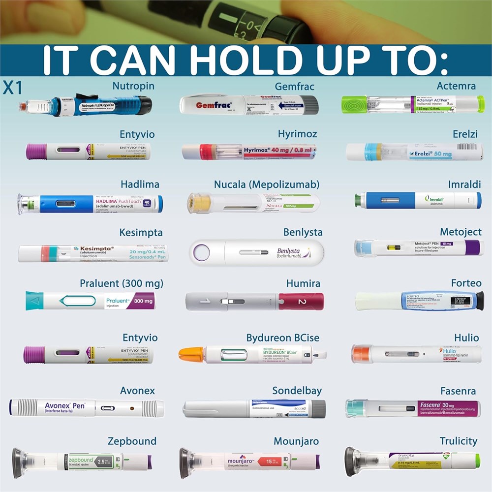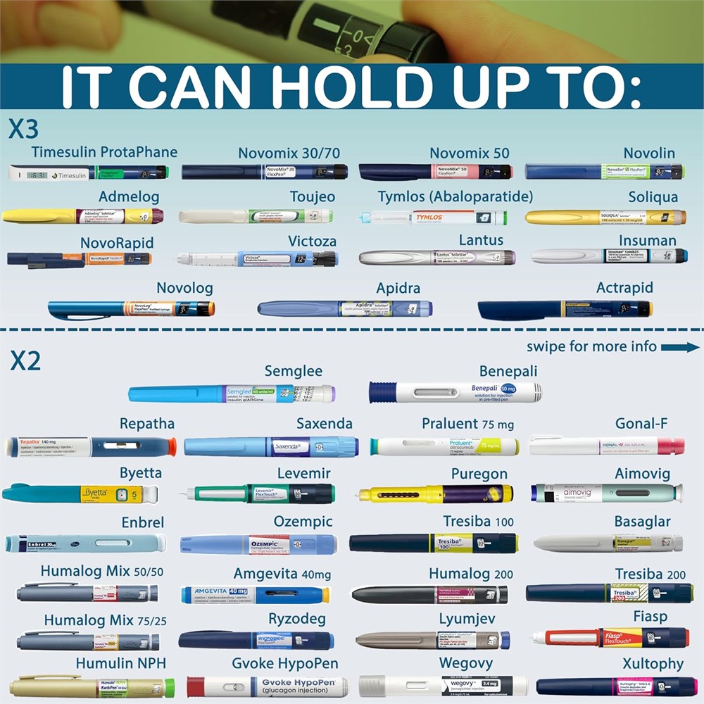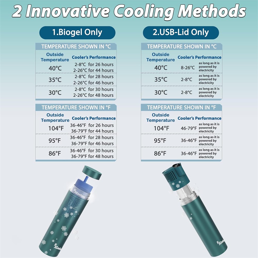 2N1 Blended technology , and slimmer size:The mini version of rxcoolers medical bag comes with 2 cooling options, while being even more portable than previous models. with a height of 10.8" and width of 2.6" and weight of 3 pounds. Anti freeze functionality and temperature display features:The built in usb lid of the rxcoolers medical case is equipped with a smart thermostat sensor that measures and control temperature, preventing medice from freezing and also you can see real time temperature through LCD display. Designed with advanced cooling technology, RXCOOOLER insulin pen cooler Mini version uses double-layer vacuum insulation and bio gel packs to maintain fridge temperatures for at least 27 hours, even in extreme outdoor temperatures up to 95 F (35 C). With the usb feature, it will keep medicine cold as long as it is being powered by usb. Use usb functionality only when you have a power source to charge it. Otherwise use normal non usb lid because it has better insulation capacity. TSA APPROVED medical cooler: All Rxcoolers insulin travel cases can pass through security checkpoints without hassle. This discreet insulin travel cooler is TSA-approved, making sure your insulin and other medications stay cool & safe. VERSATILE MEDICATION STORAGE: VERSATILE MEDICATION STORAGE: Accommodates a variety of insulin pens and EpiPens, such as Toujeo, Novolog, Victoza, and more. Please carefully, check images to verify compatibility or capicity with your medication , or contact our support team for assistance. Our insulin cases are perfect for daily use or longer trips. IF THE MEDICATION YOU ARE USING IS NOT IN THE LISTING, PLEASE REFER TO THE FREE SPACE TO DETERMINE CAPACITY OR KINDLY ASK SUPPORT TEAM.