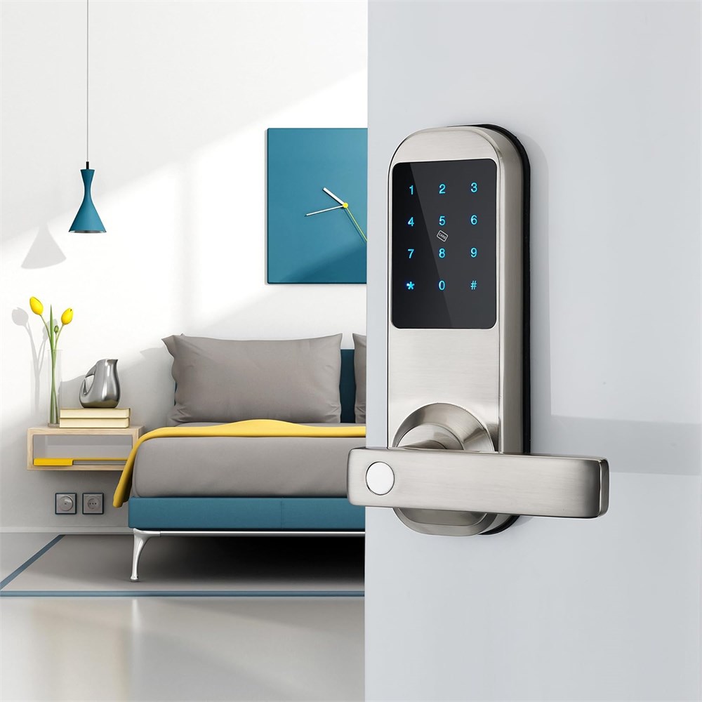 Unlock with M1 Card, Pass Code or Mechanical Key,Voice Navigation While Operating 1000 Total Users and Quickly Add or Delete User Passcode, Keyfob Individually. Touch Screen, Waterproof, Excellent for Exterior Use and Interior Doors,keys, Hidden keyhole, Easy Right or Left Handle Switching, Stay Unlocked Mode Available. Keypad illumination, Standard Latch(2 3/8" 60mm and 2 3/4" 70mm adjustable) 4 AA (not included) Batteries Required. Extra card ASIN B01LERW8WU(Card Shape) or ASIN B071ND8T5T(Key chain shape)
