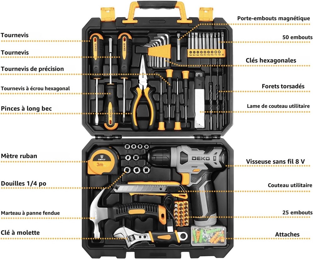 Perceuse sans fil 8 V avec LED : la perceuse sans fil lectrique 8 V peut tre utilis e pour percer le bois et le plastique, et galement pour serrer/desserrer les vis. Appuyez sur l'interrupteur pour r gler la vitesse de la perceuse lectrique, et la vitesse maximale vide de la mini perceuse est de 800 tr/min. quip d'une lumi re LED int gr e, et le poids net de la perceuse manuelle est de seulement 0,7 kg, et il est facile utiliser d'une seule main. Batterie rechargeable de 1,5 Ah, c ble de type C : cette perceuse est fournie avec un c ble de charge de type C 1,5 A. Vous pouvez la connecter un chargeur universel ou une sortie USB (5 Vd.c) pour charger l'outil. Le voyant de batterie est l'arri re de l'outil, lorsque l'indicateur de batterie vert est stable sans clignoter, la batterie est pleine. Design ergonomique, facile utiliser : les outils sans fil sont fabriqu s en alliage d'acier, plaqu chrome pour viter la corrosion, la prise en main est antid rapante et confortable. Les outils l gers, durables, solides, s rs et compacts sont parfaitement adapt s pour une plus longue dur e de vie. Quatre tournevis de pr cision sont pour les petites fixations sur les appareils m nagers et lectroniques, deux tournevis pleine taille et une poign e de tournevis lorsque seule une touche manuelle est n cessaire, un marteau, une pince, un ruban adh sif et un coupe-bo te pour un ensemble polyvalent pour le bricolage g n ral. Kit d'outils multifonction pour perceuse-visseuse sans fil : ce lot de perceuses lectriques professionnelles contient les outils les plus pratiques et avanc s pour la conception, la r paration ou l'entretien. Il est parfait pour la d coration, l'assemblage de meubles, le per age, la coupe, le jardinage, le bureau ou l'entretien quotidien de la maison. Les outils sont soigneusement rang s dans un tui robuste pour les garder en s curit , propres, organis s et faciles trouver. Contenu de l'emballage : 1 tournevis sans fil 8 V ; 1 tournevis crou hexagonal ; 2 tournevis ; 4 tournevis de pr cision ; 6 forets torsad s ; 8 cl s hexagonales ; 1 porte-embouts magn tique ; 10 embouts de 50 L ; 18 embouts 25 I ; 9 douilles 6,35 mm ; 1 ruban mesurer uler; 50 * Fixations ; 1 marteau panne ; 1 cl r glable ; 10 lames de couteau utilitaire ; 1 couteau utilitaire ; 1 pilier long bec ; 1 manuel de l'utilisateur (fran ais non garanti).