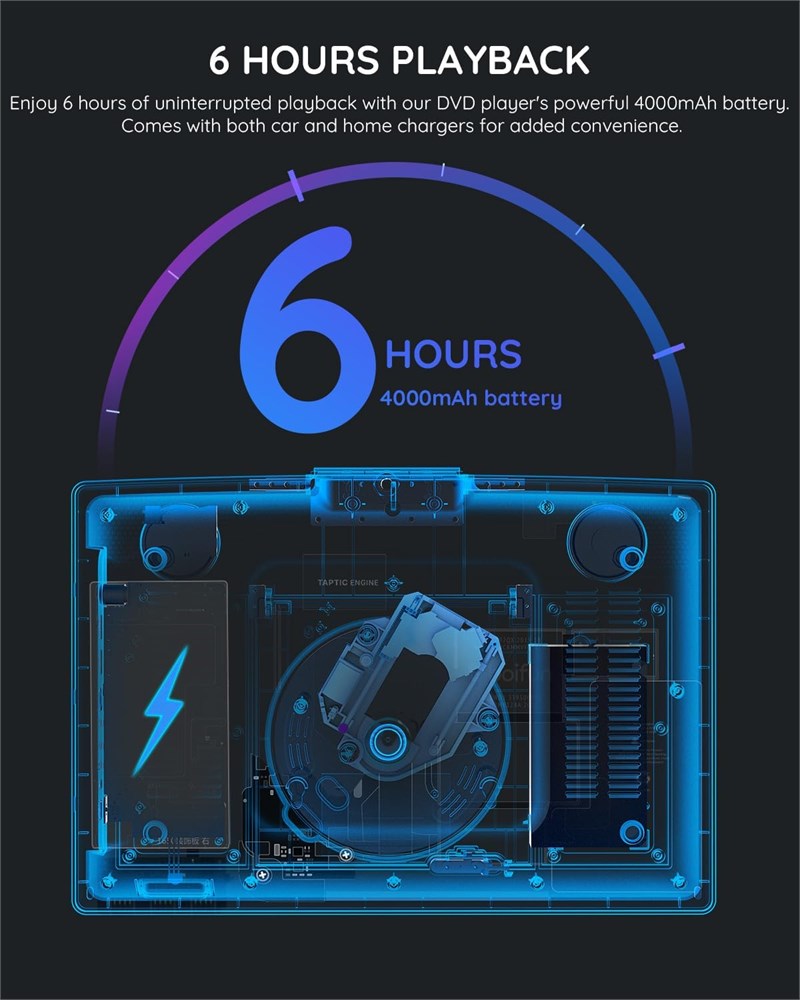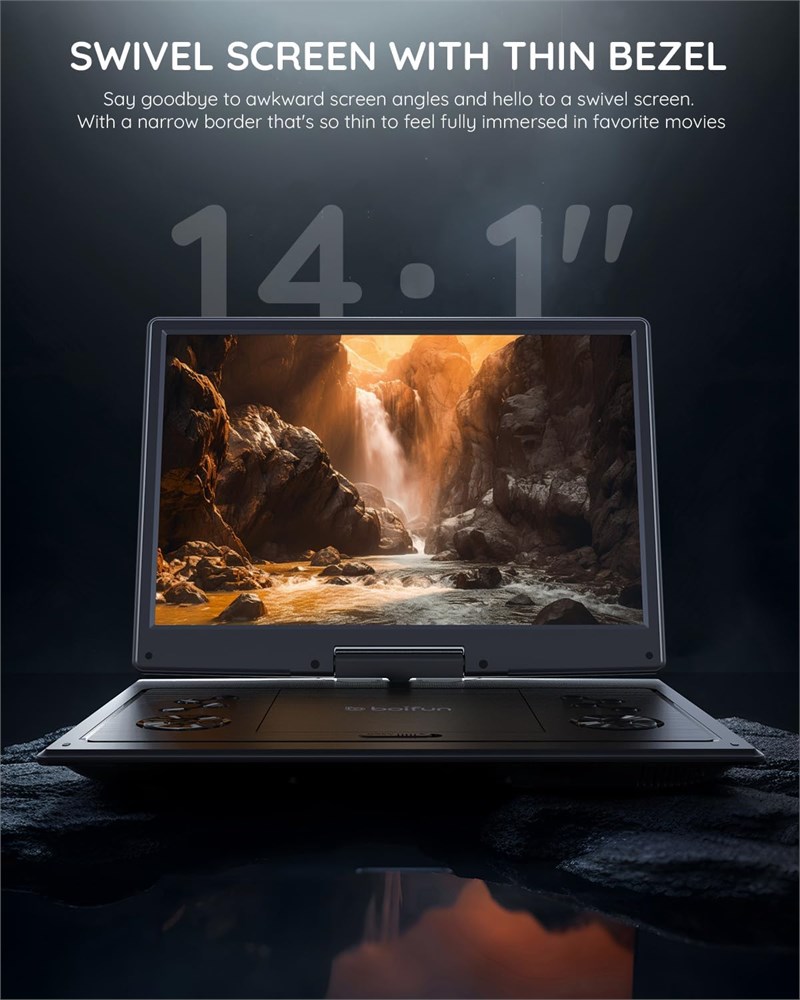 SCREEN QUALITY With advanced screen tech, the 14.1" swivel screen of Boifun DVD player shines brighter and clearer than its predecessors. Enjoy clarity and vividness with its 1366*768 resolution LONG-LASTING POWER 4,000mAh battery, 6 hours of playtime on a single charge. Includes car charger and AC adapter for ultimate convenience. Great way for extended trips and prolonged entertainment DYNAMIC SOUND Upgraded dual speakers with adjustable volume levels for meeting varying age requirements. Set your preferred sound level, from loud to low, with ease on DVD player Anti-Shock Protection This portable DVD player for kids or parents has anti-skip protection ensures that the DVD player will not interrupt the playback even in the state of shaking and bumping. Also, reduce the noise from the spinning discs. Bring you a better experience during a long trip. Boifun SIMPLESYNC Boifun SimpleSync pairs your portable DVD player with a selected TV or projector for a better personal TV-watching experience. Simply connected by a single AV cable, you are free to watch your favorite movies on the big screen. EFFORTLESS OPERATION Convenient Features designed for ease of use such as Last Memory Display, Region-Free Disc Support, Slow/Fast-Motion Playback, A-B Looping, CD Music Playback, upgraded remote control, and Beyond. And some are waiting for your discovery. SUPPORTED FORMAT Compatible file format for Boifun portable DVD player: CD-R, CD-RW, VCD, SVCD, CVD, DVD R, DVD RW, MP3, WMA, OGG, AAC, AVI, MPG, VOB, FLV, RMVB; JPG; MP4 Need To Be Converted to AVI. If you have trouble with this, we can offer help from that. CUSTOMER HELP Boifun offers problem-solving assistance to all customers as a duty. If you are experiencing any issues with your DVD player, please do not hesitate to let us know. we promise will get back to you within 24 hours, and love to hear from you about any situation.
