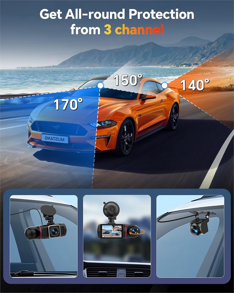 Professional 3 Channel Dash Cam Front and Rear Inside Upgrade your vehicle s security with our advanced 3 channel dash cam, offering full HD 1080P for the front and 720P for both inside and rear views. Kussla dash cam has a wide 170 front camera, a 150 built-in camera, and a 140 rear dash camera. This comprehensive car dashcam allows you to simultaneously monitor the front, rear, and interior of your vehicle, ensuring you don t miss a thing on the road Dash Cam Front and Rear Camera with Super Night Vision The car camera dash cam front and rear adopts the upgraded Sony IMX335 STARVIS sensor, the f/1.8 aperture large lens & WDR technology observes the road ahead. Our car camera excels in low-light conditions, providing clear and crisp images and videos day and night Dashcam with Motion Detection & Parking Monitor The dash camera for cars is sensitive to vibrations, waking up and recording a 30-second video upon detecting any movement. 24-hour parking mode, this car dash camera offers a full day of recording when the car is turned off, hardwire kit is needed for this feature(not included in the package) Dashcam Front and Rear Camera with Loop Recording Dash camera front and back with seamless loop recording function, the newest recorded video will overwrite the oldest video when memory card is full, The car camera contains a 64GB card, which has been inserted into the body of the driving recorder. (recommended to turn off the motion detection and parking monitoring functions during driving, otherwise multiple files will be automatically locked and the memory will be full) Easy to Install Dash Camera This dashcams for cars is equipped with a suction cup that can be rotated 360 and can be easily attached to any position on the windshield. Connect the red part of rear camera cable with the positive pole of reversing light, it will appear reversing mode when you parking, No recording when you reversing. If your car already has built-in reversing system, no need to connect the red wire.
