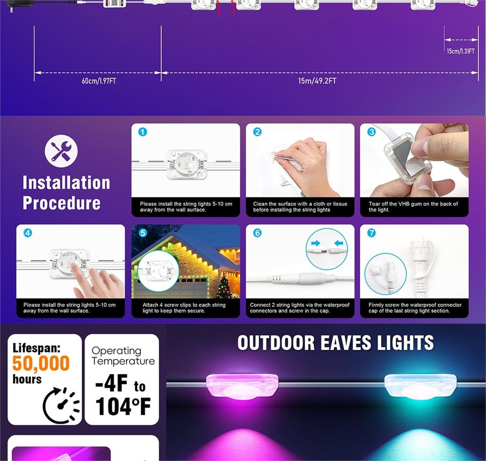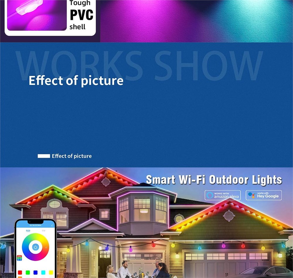 Works With AlexaAfter connecting Outdoor Intelligent colorful Eaves led Lights to Wifi (2.4GHz 802.11b/g/n) ,you can control it realize remote control,count down/ timing, sharing control, smart scenes, and other functions. Intelligent colorful Eaves led Lights Excellent Intelligent colorful Lighting Effect ,You can create a dreamy atmosphere with up to 234 dynamic style modes, 33 built-in scene modes and 16 million colors for the eaves, yards, roofs, patios, garages and more. APP & Voice ControlEasy to adjust the light color and brightness,by APP or remote control, perfect for adding warm ambience for Christmas and spooky atmosphere for Halloween; intelligent voice service allows you to control the light with Alexa.(hi ,Alexa,open my light) Custom lighting Each LED light can be controlled individually through the application, 16 million colors can be selected, which can adapt to the customization of various holiday lights. Includes static and dynamic lighting modes. You can also adjust the brightness and speed of the light. Multifunctional In addition to the function of DIY lighting, this smart outdoor light also has a music rhythm mode. The lights can also change color following the phone's camera. Flexible timing also allows you to save energy. Easy Installation - Use adhesive glue to install lights quickly, or use screws and clips to secure them. Please NOTE: This Christmas permanent outdoor lights cannot be cut and remember to check the lights work properly before installation.
