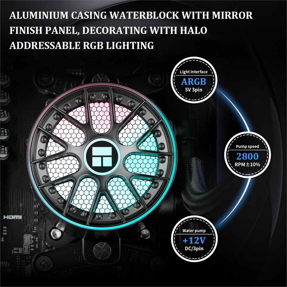 Round Colorful Pump Head The vortex round cold pump head adopts the exclusive structure of the fourth-generation water pump, the vortex design and the ARGB halo under the logo luminous logo, creating a colorful and unique visual experience, and the pump speed can reach 2800RPM 10%, which can effectively dissipate heat Excellent LED Lighting Effect The ARGB of the pre-installed CPU fan and water block is synchronized with the 5V 3pin on the motherboard to achieve light synchronization, 1600W color soft light effect, efficient cooling and rich light effects at the same time, support lighting effect series and motherboard synchronization, and avoid insufficient lighting interfaces High Airflow Output The aio radiator provides an airflow of up to 70.84CFM, providing the performance required for the latest Intel or AMD runtime, increasing the overall cooling efficiency, and the lighting color of the ARGB fan can be manually adjusted 3 PWM Fans Radiator pre-installed fan TL-N12-R5-S, speed up to 2000RPM 10%, size: 120x120x25mm, noise 29.8dBA, power supply interface: 4PIN PWM, Lighting interface: 5V/3PIN ARGB, Air pressure: 2.63mmH2O(MAX), Air flow: 70.84CFM(MAX), with PWM and ARGB function, automatically adjust the speed according to CPU temperature, The cpu fan's four feet reduce vibration and noise More Details The three CPU fans pre-installed in the radiator do not need to be installed manually, the series function of the fan can solve the problem of insufficient power supply interface, and at the same time avoid the confusion of cables Easy to Install The AIO cooler is compatible with AMD: AM4/AM5, Intel: LGA1851/1700/1150/1151/1155/1156/1200 and other sockets, and comes with mounting accessories corresponding to dual platforms, which is easy to install and can be installed according to the manual and video. (Note: AMD motherboards are installed using the motherboard's original backplane)