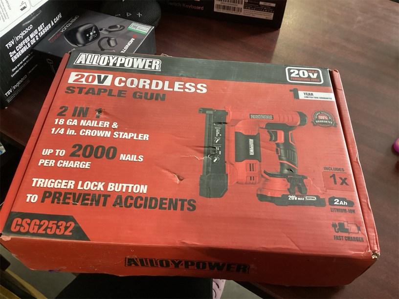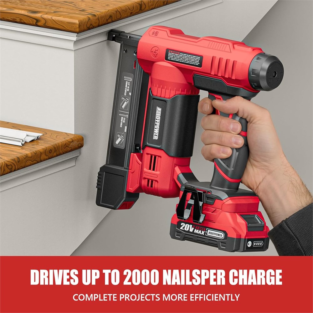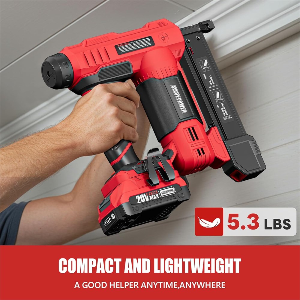 CORDLESS CONVENIENCE Say goodbye to bulky compressors, pesky hoses, and expensive gas cartridge tools with the ALLOYPOWER cordless nail gun. The 18-gauge nail gun is battery-powered, giving you the flexibility and portability to work anywhere. 2-IN-1 CORDLESS BRAD NAILER/ELECTRIC STAPLER ALLOYPOWER 2-in-1 brad nail gun/staple gun is a versatile tool that can drive a range of 18 GA brad nails(5/8 -1 -1/4 ) and 1/4 18GA crown staples(5/8 -1 ) perfect for DIY projects, woodworking, interior decoration, fence slat repairs trim work, and more. LARGE CAPACITY BATTERY 20V lithium-ion battery has a large capacity and is very durable, not only the running time is extended by 80%, but also the battery life is extended by 60%, Each full charge can fire 2000 nails, allowing you to complete the job quickly and efficiently. PERFORMANCE ADJUSTABILITY The upgraded depth adjustment design, combined with the rotary adjustment knob, allows you to adjust according to the needs of your DIY project freely. Whether it is hardwood or soft gypsum board, the ALLOYPOWER 18GA electric nail gun can be accurately adjusted according to the actual situation to obtain the best penetration performance of the nail. SAFETY & CONVENIENCE You can shoot nails or staples only when the safety nose pin is fully pressed against the work surface, preventing accidental shooting of nails. In addition, it is equipped with an LED light and a convenient belt hook to ensure precise nail shooting even in low-light conditions and provide portability for work. WHAT YOU GET 1 18GA brad nailer ,1 20V Battery,1 Charger,500PCS staples,1000PCS nails.