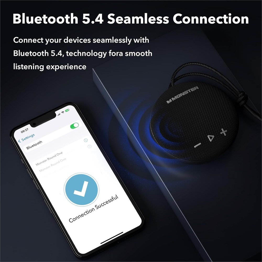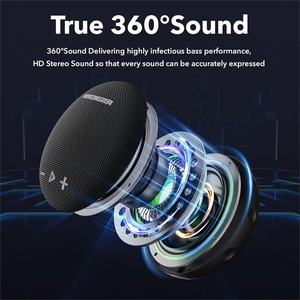 Pure Monster Sound - The Monster Round One Bluetooth speaker is designed and engineered by Noel Lee and the Monster Team in the USA. From 40 years of sound engineering fine-tuned to deliver the most impactful music experience possible. Dynamics with substantial deep bass punch, clarity and details revealed, and no distortion at any level, a truly unparalleled listening experience. IPX8 Waterproof Shower Speaker - Portable travel speaker for completely waterproof design, can be fully immersed up to 1 meter for about 30 minutes underwater perfect for various water activities like swimming, kayaking, or enjoying your music at the beach. No worries about weather and outdoor condition, applicable to any weather. Advanced Bluetooth 5.4 Technology - Enjoy seamless wireless connectivity with the latest Bluetooth 5.4, ensuring faster pairing, easily connect to any Bluetooth device, stable connections, and superior audio quality up to a long range. It is a portable wireless bluetooth speaker that is very suitable for outdoor sports and cycling sports. Portable Bluetooth Speaker- The compact Monster Round One Bluetooth Wireless Speaker is easy to carry around, Built-in microphone for a clear hands-free call, convenience up! Includes the lanyard, a detachable suction cup, and easy to attach shower speaker to bathroom tiles and mirrors.built-in hook with a carabiner so you can hang the portable speaker on backpack, bicycles, carts and anywhere you like, very suitable for indoor and outdoor. Speaker: Long battery life - With the top-of-the-line rechargeable li-ion battery, listen to up 24 hours of continuous music playback at the appropriate volume, so that music can be played non-stop from day to night.