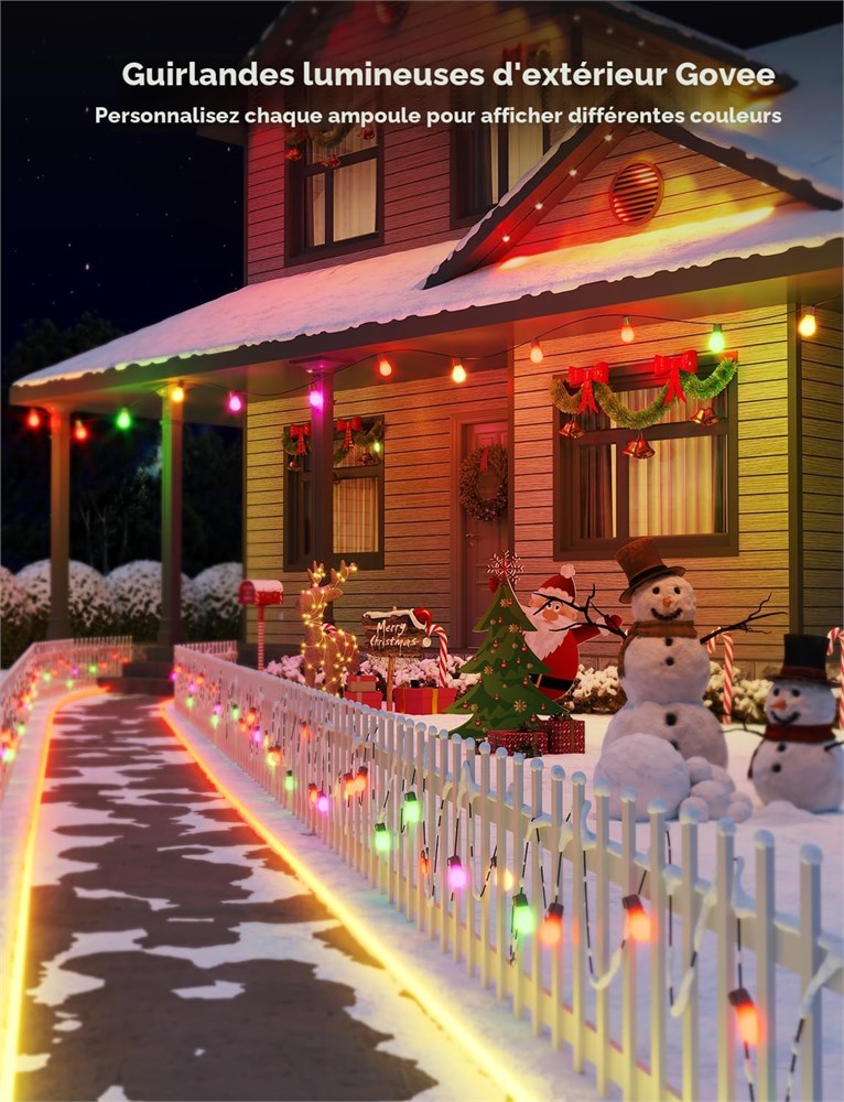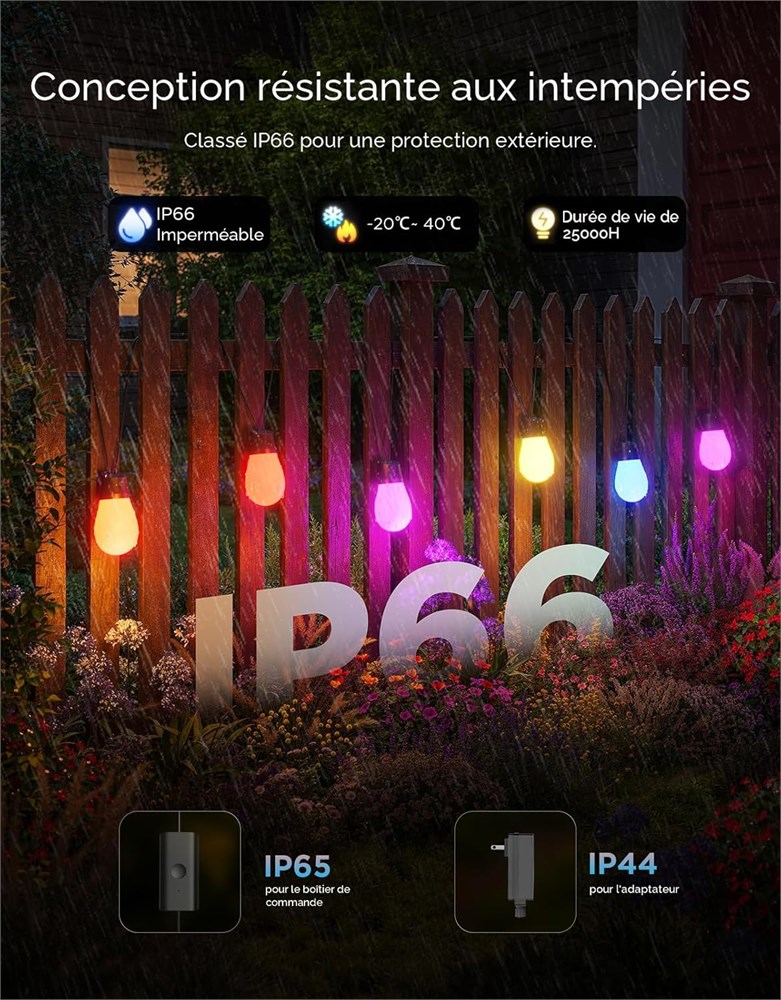 Effet d' clairage RGBICW : avec 16 millions de couleurs et 65 lm intensit variable blanc chaud par lumi re, la guirlande lumineuse pour l'ext rieur remplit sans effort votre terrasse de diff rentes couleurs vives pour aider vos d corations d'ext rieur se d marquer dans divers festivals. Durabilit ext rieure : avec tanch it IP66 et dur e de vie allant jusqu' 25 000 heures, la guirlande lumineuse ext rieure Govee fonctionne normalement des temp ratures de -15,6 C 40 C, assurant un clairage fiable dans n'importe quel environnement. Remarque : le bo tier de commande est IP65, l'adaptateur est IP44. Son dynamique et effet de lumi re : d verrouillez la magie des guirlandes lumineuses d'ext rieur avec 111 modes de sc ne vibrants et un micro int gr qui se synchronise avec la musique. Am liorez votre d coration d' t ext rieure et laissez votre terrasse danser avec un clairage dynamique. Mode DIY cr atif : personnalisez vos couleurs et modes d' clairage via l'application Govee Home pour mettre en valeur votre d coration ext rieure personnelle. Allumez votre cr ativit avec le mode DIY de ces guirlandes lumineuses pour cr er votre clairage ext rieur et votre d coration de vacances. Application intelligente et contr le vocal : g rez vos lumi res ext rieures via l'application Govee pour une exp rience AIGC et minuterie. Profitez du contr le vocal avec Alexa et Google Home, ainsi que de la prise en charge Matter pour une int gration facile dans vos d corations ext rieures intelligentes. Installation facile : nos ampoules LED l g res et durables disposent d'ouvertures int gr es pour des options polyvalentes. Profitez d'une installation sans tracas sans outils professionnels ni tapes complexes. Installez facilement ces guirlandes lumineuses n'importe o , ce qui permet d' conomiser du temps et des efforts. Remarque : ce produit ne prend pas en charge l'extension ou l' pissure.