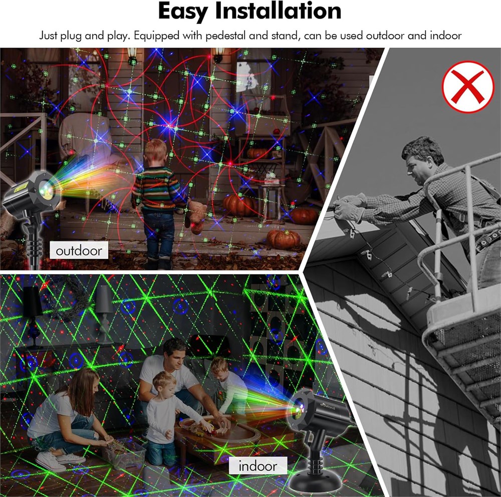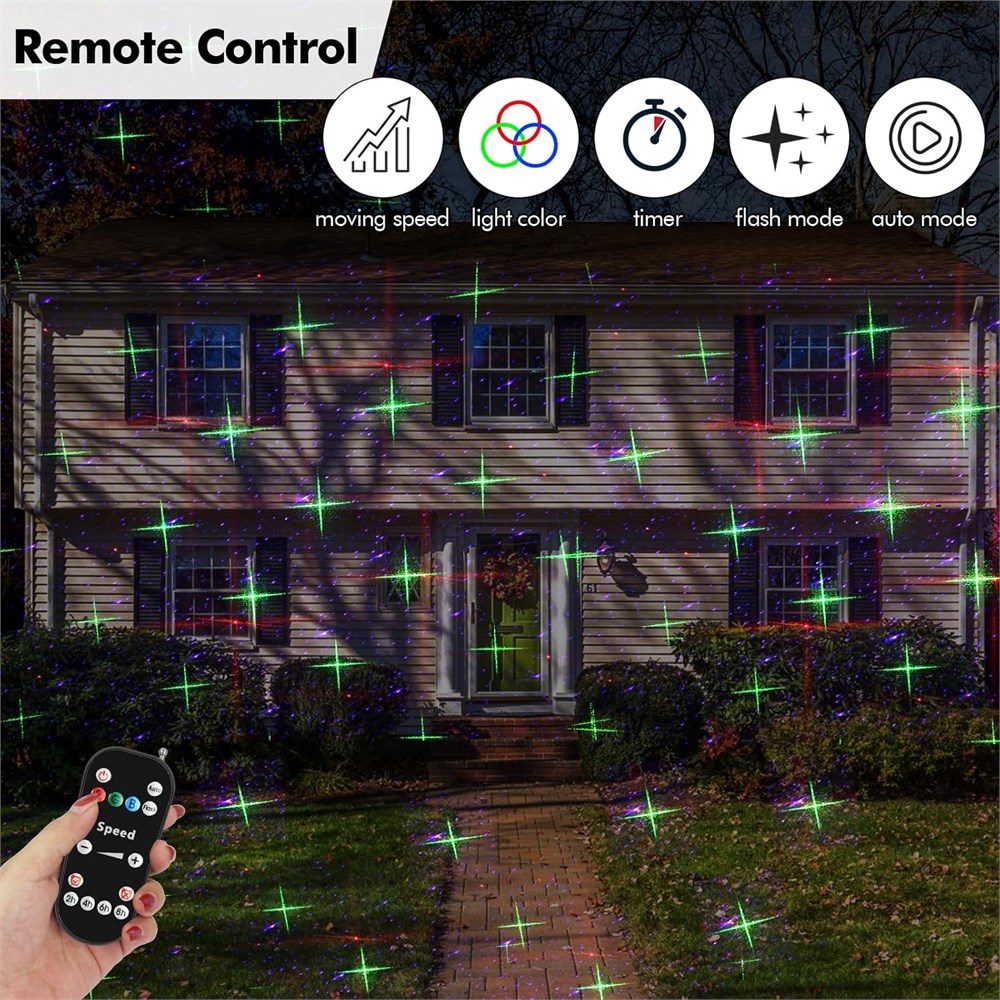 Transform any space into a festive wonderland with our 3-color garden Christmas laser projector light, featuring blue, red, and green dots that project 8 mesmerizing patterns. Take full control of the experience with the easy-to-use remote that lets you adjust the speed, color, and mode (flash or auto) and set a timer for 2, 4, 6, or 8 hours. Enjoy peace of mind knowing that our laser projector's light beam is less than 1mw and completely harmless to humans, making it a safe and family-friendly addition to your home. Say goodbye to complicated setups - simply plug in and play! Our laser projector comes with a pedestal and stand for outdoor and indoor use and adjustable projection angle to achieve the best effect. From garden and home decoration to family parties, holiday celebrations and clubs, our projector light offers a wide projection coverage area and is ideal for creating unforgettable festive moments.