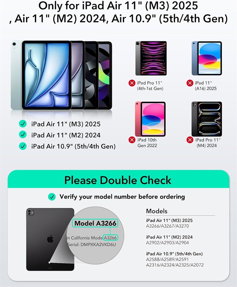 Compatibility: only for iPad Air 11" (M4) 2026, Air 11" (M3) 2025, Air 11" (M2) 2024, Air 5th/4th Gen; models A3266, A3267, A3270, A2902, A2903, A2904, A2588, A2589, A2591, A2316, A2324, A2325, A2072 Magnetic Detachable Design: a secure magnetic connection lets you attach the keyboard for typing or remove it for a streamlined tablet experience perfect for reading, watching, or drawing; instantly transform your iPad into a laptop and back again Ultimate Flexibility: effortlessly switch between portrait and landscape modes for work, study, or entertainment; the adjustable landscape stand (20 75 ) adapts to your perfect viewing angle, while the sturdy 20 low-angle magnetic support is ideal for writing or drawing; detach into single-case mode for gaming enjoy unmatched versatility, unlike fixed designs Larger Click-Anywhere Trackpad: the fully responsive, 65% larger trackpad features a 112 70 mm surface, providing smoother and more precise control; this iPad keyboard enhances navigation with full iOS gesture support for easier editing, browsing, or switching apps Ultra-Thin & Lightweight: at just 7.2 mm thick, this keyboard is super slim and easy to carry anywhere; the lightweight design fits perfectly into your daily routine great for working on the go without any extra bulk.