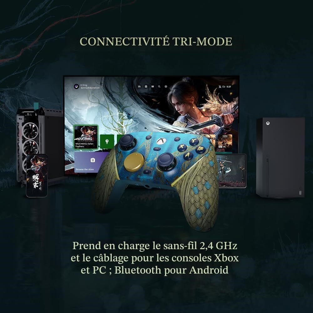 Manette sans fil sous licence officielle pour Xbox : en tant que premi re manette sans fil GameSir pour Xbox, elle dispose d'une connexion sans fil 2,4 G et d'un r veil en une seule pression pour les consoles Xbox, vous offrant un jeu rapide et fiable et une activation de la console sans effort. Connectivit trimode : l' dition G7 Pro Wuchang: Fallen Feathers prend en charge une connectivit transparente sur Xbox, PC et Android. Basculez sans effort entre les modes l'aide du commutateur de mode physique pratique. Choisissez entre 2,4 G sans fil et filaire pour consoles Xbox et PC ; Bluetooth 5.3 pour Android. D clencheurs analogiques effet Hall : les d clencheurs analogiques effet Hall GameSir offrent une fluidit in gal e et une entr e lin aire pour un contr le pr cis. Avec des arr ts de d clenchement Clicky Micro Switch, les joueurs peuvent facilement basculer en fonction de leurs pr f rences. Taux d'interrogation de 1000 Hz : profitez d'un jeu ultra-r actif avec un taux d'interrogation de 1000 Hz sur PC, disponible via des connexions filaires et sans fil 2,4 G. Cela garantit un enregistrement instantan des entr es, r duisant le d calage et optimisant vos performances pour le jeu le plus comp titif. Station de charge intelligente automatique Start-Stop : l' dition G7 Pro Wuchang: Fallen Feathers est livr e avec une station de charge intelligente et une batterie int gr e de 1200 mAh, offrant une autonomie prolong e pour des heures de jeu ininterrompu. Il suffit de placer le contr leur sur la station pour commencer charger et de le prendre pour jouer.