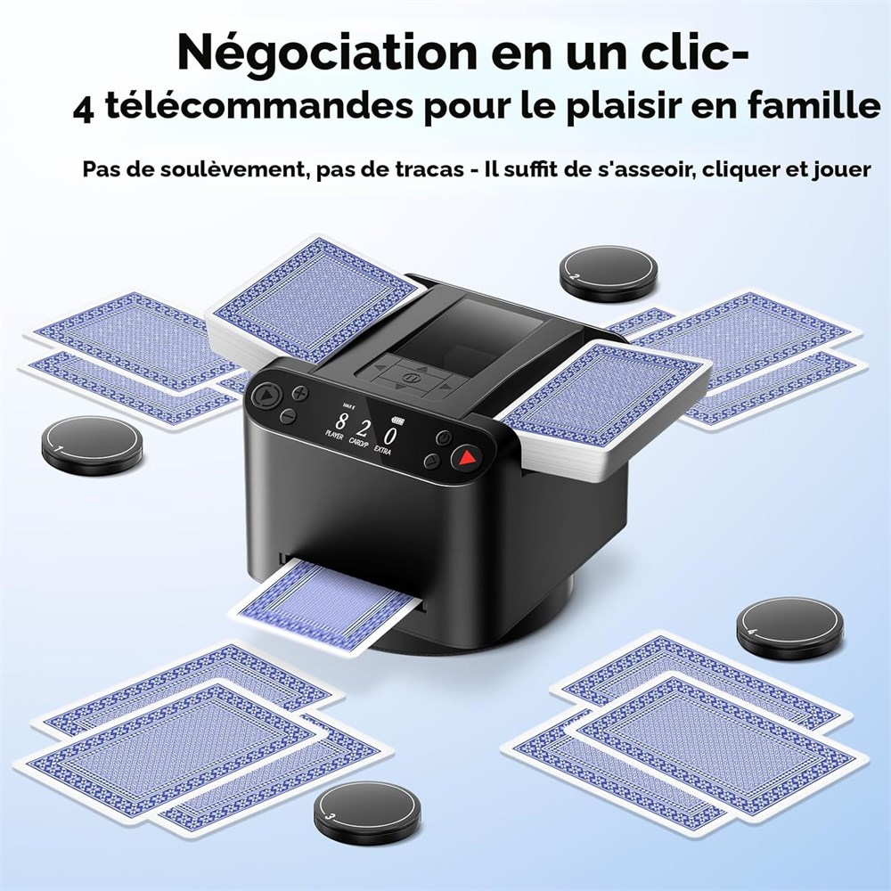 M langeur et distributeur de cartes 2 en 1 pour un jeu sans effort Le m langeur et distributeur de cartes automatique BATURU combine le m lange et la distribution dans une machine compacte. D une simple pression, il m lange et distribue les cartes de mani re fluide, liminant l effort manuel et assurant un jeu sans erreur pour le poker, l UNO et plus encore. Parfait pour les soir es de jeux et les voyages. Supporte 12 joueurs avec modes de rotation 360 /180 Parfait pour les grandes r unions, ce m langeur de cartes et distributeur ajuste le nombre de cartes et la direction pour le Texas Hold'em, le Blackjack et le Rami, assurant un jeu quitable et captivant pour jusqu' 12 joueurs. 4 t l commandes sans fil pour un tirage facile de cartes Comprend 4 t l commandes sans fil pour le tirage de cartes distance, parfaites pour les jeux comme UNO et Phase 10. Les joueurs peuvent tirer des cartes facilement en appuyant sur la t l commande, am liorant la commodit et r duisant les interruptions pendant le jeu. Fonctionnement ultra-silencieux pour un jeu concentr Contrairement aux alternatives bruyantes, le m langeur de cartes et le croupier BATURU fonctionnent silencieusement, maintenant une atmosph re calme pour des sessions de jeu prolong es. Profitez d'un plaisir ininterrompu pendant les soir es en famille ou les r unions sociales. Batterie rechargeable pour une utilisation prolong e quip d'une batterie rechargeable de 5200mAh, ce m langeur de cartes et distributeur peut g rer jusqu' 150 jeux sur une seule charge. Fini les piles jetables, respectueuses de l'environnement et conomiques pour de longues sessions de jeu. Design r glable pour plusieurs tailles de cartes : le d flecteur de cartes r tractable et les plateaux ouverts s'adaptent diff rentes tailles de cartes, du poker UNO. Ce m langeur et distributeur de cartes polyvalent assure un fonctionnement fluide avec tous vos jeux pr f r s.