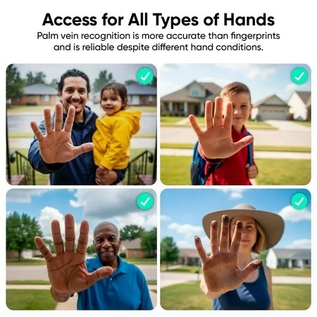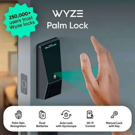 Contactless, Secure Entry with Palm Vein Recognition: Wyze Palm Lock uses a highly secure, contactless biometric technology that identifies you based on the unique pattern of veins beneath the surface of your palm. Just hover your palm near the reader, and voil , the door unlocks. It s like a secret handshake with your front door. It's fast and even more reliable than fingerprints. Numbered Keypad with Access Codes: A bright, numbered keypad illuminates with a simple tap. Set and store up to 50 unique access codes, or create one-time guest passcodes that expire on a schedule. Dual Battery System: The main is a removable lithium ion battery that provides up to 6 months of battery life. A secondary backup battery keeps things running for up to two weeks while you charge the main. Auto Lock: A built-in gyroscope detects the angle and movement of the door in real time. Once it senses the door has closed then it automatically locks, preventing false or jammed locks. Anti-Peep Technology: Don t worry if someone watches you enter your code. Simply add extra digits before or after your code and Wyze Palm Lock will still unlock.