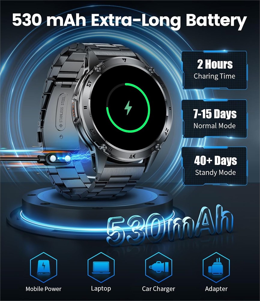 Military-Grade Build and 5 ATM Water Resistance The EF6 Smartwatch for Men has a zinc alloy case, offering effective protection even under high temperature, pressure, sand, dust, salt fog, and liquid exposure. The 5ATM waterproof rating ensures the watch performs flawlessly underwater, in the rain, and in swimming pools. It s ideal for various outdoor sports and challenging work environments. 530 mAh Battery Delivers 40+ Days of Use The military-grade smartwatch s 530 mAh polymer battery offers up to 70 days in standby mode, about 20 days of regular use, 15 days in Always-On Display (AOD) mode, and 10 20 hours of LED flashlight runtime. With just 2 hours of charging time, it significantly reduces charging frequency, keeping you connected anytime. It s the perfect choice for your smartwatch needs. AMOLED Display and Ultra-Bright LED Flashlight The EF6 Smartwatch features a 1.43-inch AMOLED screen that is slim, lightweight, energy-efficient, and responsive, delivering a unique visual and user experience. The built-in LED flashlight (approx. 150 lumens) can be activated with a single press on the left side of the watch, providing continuous lighting for outdoor adventures, hiking, and nighttime travel. (One-touch switch) Bluetooth Calls and Message Notifications on Your Wrist The LIGE 2025 Smartwatch for Men features a built-in high-performance microphone and speaker, enabling smooth and clear calls. It displays social app notifications directly on the smartwatch when you're busy, exercising, traveling, or working outdoors (Bluetooth range: 10 meters). You ll never miss important calls or alerts. 110+ Sports Modes and Health Monitoring The smartwatch s multiple sports modes cater to fitness enthusiasts and prevent workout routines from becoming monotonous. The LIGE EF6 Smartwatch for Men provides health monitoring, tracking your physical well-being, including sleep patterns( deep sleep, light sleep and wakefulness), calorie consumption, and exercise records. Comfortable and Efficient The LIGE Smartwatch for Men brings convenience to your life, making it more efficient, healthier, and better organized. For example: waking up in the morning (alarm), work routines (message reminders), commuting (Bluetooth calls), socializing, and entertainment (music playback). This smartwatch provides comfort and support in every aspect of life. Multifunctional Smartwatch Discover even more features of the EF6 Smartwatch, such as AI voice assistant, health monitoring, exercise tracking, music playback, weather updates, phone finder, calculator, and more. Whether for daily management, sports recording, music entertainment, or call needs, it delivers efficiency, bringing convenience and intelligence to your life. 2025 Compatibility and Choice The EF6 Smartwatch for Men is compatible with Android 4.4+, iOS 8.0+, and supports Bluetooth 5.0. The LIGE Smartwatch for Men is an excellent choice for 2025 festivals, birthdays, Valentine s Day, Christmas, and New Year gifts.