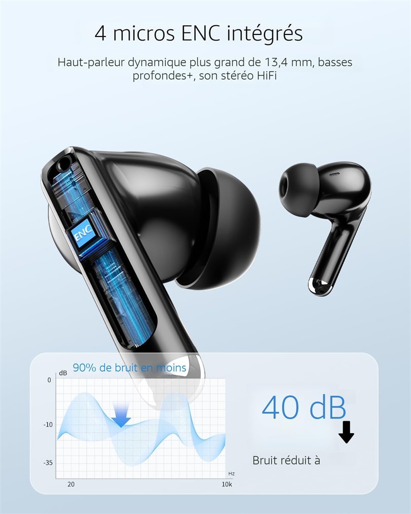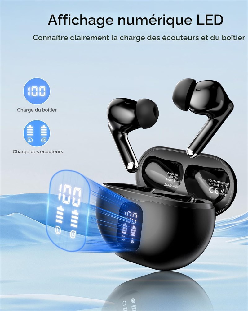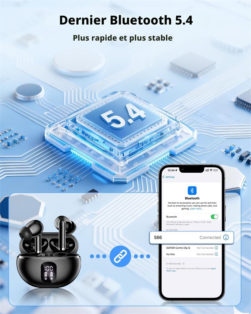 Bluetooth 5.4 et prise automatique en une tape : les v ritables couteurs sans fil utilisent la derni re technologie Bluetooth 5.4 pour une transmission plus stable et une plus longue port e, vous offrant une exp rience d'appel et de musique ininterrompue. Apr s le premier appairage, retirez simplement les deux couteurs sans fil de l' tui de chargement et ils se jumeleront automatiquement 50 heures de lecture et double affichage LED : chaque couteur dure jusqu' 8 heures sur une seule charge, et jusqu' 50 heures de lecture avec l' tui de charge, vous donnant une exp rience exceptionnelle et durable. En outre, les couteurs intra-auriculaires sans fil Bluetooth sont quip s d'un cran LED intelligent qui indique visuellement le niveau de puissance Qualit sonore sup rieure et appels clairs : le casque sans fil Bluetooth S66 avec diaphragme en graph ne de 13,4 mm offre des basses puissantes, des m diums clairs et des aigus lumineux, et les couteurs avec deux microphones ENC hybrides liminent passivement 85 % du bruit de fond pour des appels plus clairs Smart Touch et tanch it IP7 : le contr le tactile intelligent du casque peut parfaitement r pondre vos besoins quotidiens et apporter plus de commodit votre vie. Parall lement, les couteurs Bluetooth ont un indice d' tanch it IP7 pour r sister la sueur, la pluie et aux claboussures l g res, ce qui les rend adapt s porter pendant l'exercice et la course pied Confort et compatibilit : le casque Bluetooth S66 et l' tui de chargement sont compacts et l gers avec un cordon attach . Gr ce la puce Bluetooth 5.4, ces couteurs ont une excellente compatibilit , ce qui leur permet de se connecter sans probl me presque n'importe quel appareil audio Bluetooth.