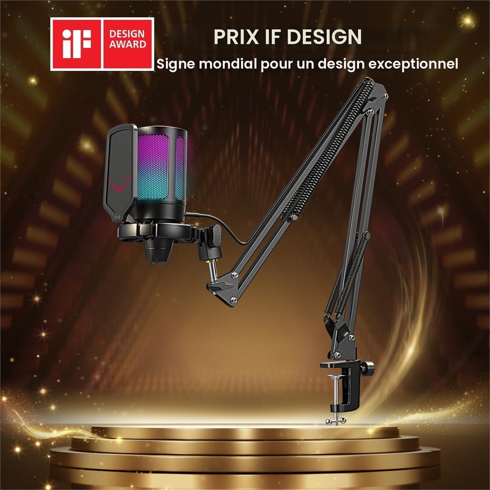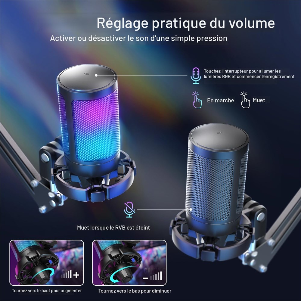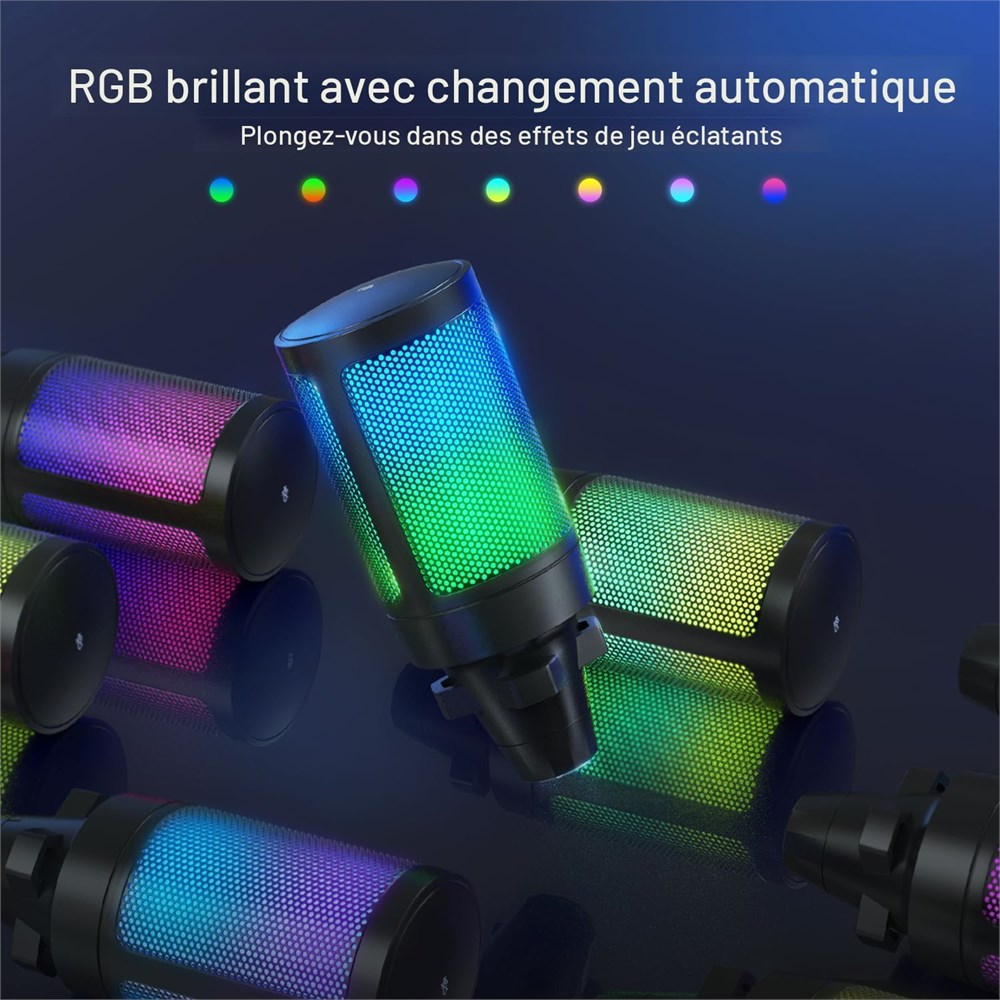 Installation facile Plug & Play : le kit de microphone de jeu USB plug-and-play fournit une connexion directe des ordinateurs ou des consoles de jeu (PS4/PS5) sans logiciel suppl mentaire. Vous pouvez entrer imm diatement dans la salle de chat du jeu. Le port de type C l'extr mit du microphone permet au c ble USB de rester verrouill , pour viter la d connexion du chat lorsque vous agitez le c ble. Le c ble USB amovible de 2,5 m est assez long du microphone de jeu fixe au PC et se d place avec le support. (Non compatible avec Xbox.) Design attrayant : l'effet d' clairage RVB automatique est calme pour vos yeux. Il est tr s cool avec vos autres jeux RVB, ce qui vous pousse entrer rapidement dans l' tat de jeu. Il fonctionne galement parfaitement avec la fonction muet. Le RVB sera teint lorsque vous coupez le micro de bureau, ce qui facilite la distinction de l' tat de fonctionnement. vitez la r v lation de la confidentialit caus e par l'oubli de couper le micro apr s avoir discut avec vos co quipiers. Touches de fonction int gr es : le toucher silencieux rapide sur le dessus du microphone est sensible et silencieux. M me si vous contr lez une manette de jeu ou un micro, il est pratique de couper le micro de jeu avec une seule main. Le grand bouton de volume convivial en bas ne vous g nera pas pour le r glage. Pas besoin de minimiser les fen tres de jeu pour r gler le volume si vos co quipiers ou votre public r pondent que votre voix est trop basse ou trop lev e. Concentrez-vous sur le jeu : fournit un son clair de qualit , le microphone de jeu PS5 pour ordinateur PC conserve plus de d tails du son original, ce qui am liore la communication de jeu entre vous et vos co quipiers, pour raccourcir le sens de la distance. Le microphone condensateur avec motif cardio de se concentre sur la source sonore principale et est sensible la voix du capteur. Vos co quipiers peuvent clairement entendre votre voix sans tre bloqu par le son du jeu. Vous pouvez tous les deux vous concentrer davantage sur le jeu. Accessoires d' limination du bruit : profitez de la libert apport e par le bras en m tal. Vous pouvez tirer le bras de la perche pour placer le micro pr s de vous, ou le mettre hors de l' cran de jeu. Avec une structure en maille compacte, le filtre anti-pop peut bien bloquer le son caus par la communication de jeu. Mont sur le microphone de bureau, le support antichoc am liore son effet anti-vibration pour r duire plus de vibrations caus es par le jeu. Contenu : 1 microphone USB avec support anti-chocs ; 1 c ble USB de 2,5 m ; 1 filtre anti-pop ; 1 pince en C ; 1 support de bras avec adaptateur ; 1 manuel d'utilisation (fran ais non garanti)