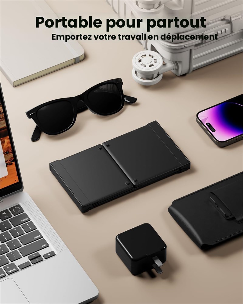 Clavier pliable avec pav tactile : ce clavier portable dispose d'un pav tactile multipoint qui s'adapte parfaitement au syst me Windows ou iOS, et dispose de diff rents gestes de pav tactile, offrant une exp rience d'utilisation confortable tout en cliquant, d filant et glissant le contenu sans effort. Tr s pratique pour taper, regarder, travailler et transporter sans souris n cessaire (Remarque : pour les utilisateurs d'iPad et d'iPhone, veuillez d'abord activer la fonction AssistiveTouch de votre appareil. Certaines fonctions gestuelles peuvent ne pas fonctionner pour des raisons li es l'application elle-m me. En outre, vous pouvez d finir la direction de d filement sur votre appareil) Clavier portable trois volets : notre clavier de voyage Bluetooth est con u avec trois volets et assez compact pour tre transport . Touches de taille standard de 88 touches avec disposition QWERTY, pav tactile et rang e enti re de touches de raccourci, vous pouvez taper rapidement et pr cis ment sur un clavier semblable un ordinateur portable, ce qui rend votre travail plus facile et plus productif Portable pour les voyages : le clavier pliable peut tre pli dans une petite taille (21,5 x 11,9 x 2 cm) pour l'emporter en d placement. Livr avec un support de t l phone et un petit sac en cuir PU sp cialement con u pour ce clavier de voyage. Il se glisse sans effort dans votre sac main, un compagnon id al pour vos voyages, visites au caf , voyages d'affaires, avions, etc. (Remarque : nous vous recommandons d'utiliser le clavier sur une surface plane car la charni re pliable ne peut pas tre verrouill e comme sur vos genoux) Synchronisation jusqu' 3 appareils : 3 canaux Bluetooth 5.1 offrent des solutions de flux de travail conviviales. Convient pour les petits appareils mobiles tels que iPad, iPhone, Steam Deck t l phones ou tablettes Android, fonctionne galement bien sur les appareils de bureau tels que les ordinateurs portables, les ordinateurs avec Bluetooth. Largement compatible avec Android, Windows, iPad OS, Mac OS, iOS, etc. (Conseil : connectez-vous uniquement via Bluetooth, et le c ble de type C juste pour le chargement). Rechargeable de type C : batterie puissante int gr e de 300 mAh, le clavier pliable permet une autonomie de veille de 120 jours. Il entrera en mode veille apr s 60 minutes d'inactivit pour conomiser de l' nergie. Vous pouvez appuyer sur n'importe quelle touche pour activer et utiliser. Lorsque vous ne vous en servez pas, pliez le clavier pour l' teindre (d pliez-le pour allumer) Conseil : sans angle l'arri re pour donner la priorit ses fonctionnalit s fines et portables, r pondez aux exigences sp cifiques d'un clavier convivial.