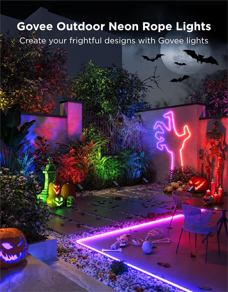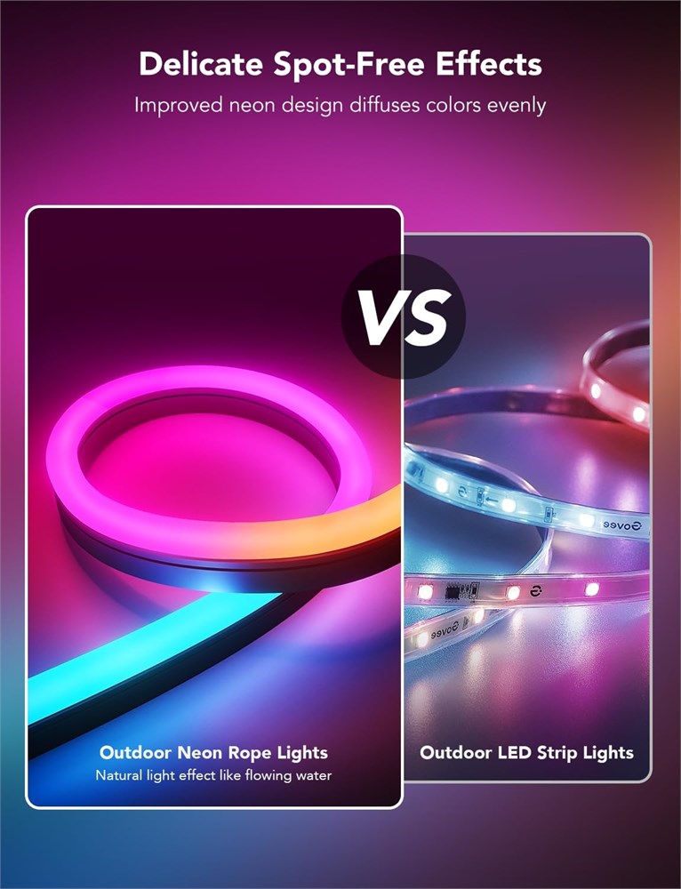 Delicate Lighting Effects: The improved design of the Govee outdoor rope lights can better radiate colorful light effects. Measuring at a whopping 32.8 feet, the patio decorations can readily bent to fit any desired pattern for outdoor decorations. Festive RGBIC Lighting: Govee Outdoor lights uses RGBIC technology, allowing you to set separate light colors as you like. Choose from 64 scene modes and 16 million colors to enhance your atmosphere in yards, gardens, lawns, and more. Waterproof and Durable: This Christmas decor is IP67 waterproof with an IP67 control box and IP65 adapter. No matter the weather, you can enjoy year-round outdoor Valentine's Day decorations for a fantastic ambiance. Simple Installation: Easily apply to walls with 30 mounting clips and 30 screws. It is recommended that clips be used with screws. You can also use the 8 angled ground sticks and 30 normal ground sticks to install the outdoor lights for any occasion. Smart Voice Control: Manage your patio decor with simple voice commands via Alexa, Google Assistant, and Govee Home App. Enjoy access to more features such as Timer and DIY, helping you create a vibrant (Not Support 5G WiFi). Sync with Music: This outdoor decorations can detect music and audio to match the lighting effects in real time to elevate your leisure time and outdoor parties. Bring a wonderful party atmosphere at any time. (Note: Do not soak product in water).