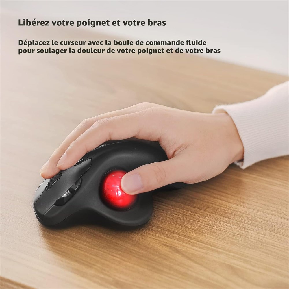 Design ergonomique avec contr le fluide du pouce : d placez votre curseur par la boule de commande lisse au lieu de d placer votre poignet et votre bras. Laissez le contr le facile et fluide du pouce vous aider r duire votre stress musculaire. L'angle optimal de la souris trackball vous permet de garder votre paume dans une position naturelle pour un confort tout au long de la journ e. Suivi pr cis avec DPI r glable : La souris trackball Nulea offre un d placement pr cis du curseur pour une pr cision et un contr le exceptionnels. Avec la molette lisse, vous pouvez tre plus productif en d placement sur presque toutes les surfaces, dans n'importe quel lieu de travail. En particulier dans les espaces troits, tels que le bureau en d sordre, le canap , le lit, le petit pupitre sur une chaise, etc. Libert sans fil v ritable : Connectez jusqu' 3 appareils par Bluetooth ou dongle USB. Basculez facilement entre eux gr ce au bouton sur le bas pour am liorer votre efficacit . Batterie rechargeable : (Pour votre meilleure exp rience, veuillez charger compl tement la souris avant sa premi re utilisation) La batterie rechargeable int gr e a une longue dur e de vie et vous permet de dire adieu aux piles usage unique. Remarque : 1. Veuillez utiliser notre c ble de charge inclus pour charger la souris. 2. Ne pas utiliser un chargeur rapide pour charger la souris. (Utilisez directement le port USB de l'ordinateur ou un chargeur 5 V pour charger la souris). 6 boutons haute performance : la souris Bluetooth Nulea Trackball est con ue avec des d tails ergonomiques bien pens s et une forme incurv e l gante. De plus, avec les boutons de retour et d'avancement, vous pouvez naviguer facilement avec une productivit accrue ainsi qu'un confort suppl mentaire. Remarque : tous les boutons ne sont pas programmables.
