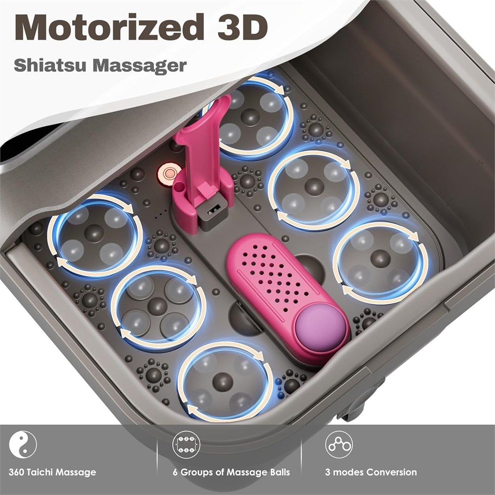 Automatic Rotary Massage:This foot spa is equipped with 6 groups of 3D Tai Chi massage balls, which automatically massage the acupuncture points on the soles. 3 modes of Massage frequency can be switched: continuous, intermittent, or intelligent Intelligent Temperature Control:The temperature ranging from 95 F to 118 F can be Precisely adjusted according to your needs. And this foot bath massager with heat will auto maintain the water temp and show the setting temp on the touch screen Dual Control: This collapsible foot spa equipped with an updated touchscreen Pro color display and Remote Control, allowing you to easily operating function with just a gentle touch or press.Besides, the massage plate and balls are removable, make this foot massager spa cleaning easy and more Hygienic Bubble & Timing:This rich bubble jet can effectively stimulate the acupressure points of your soles; The built-in timer can be set from 10 to 60 minutes, providing a relaxing foot spa experience at home. A great choice for Christmas Day, Mother s Day Practical Details:The collapsible design allows this foot soaker to be folded down to only 5.5 inches thick for easy storage in small spaces. This heated foot spa comes with the support rod to prevent accidentally folding while using and the drain hole make pouring water effortless.
