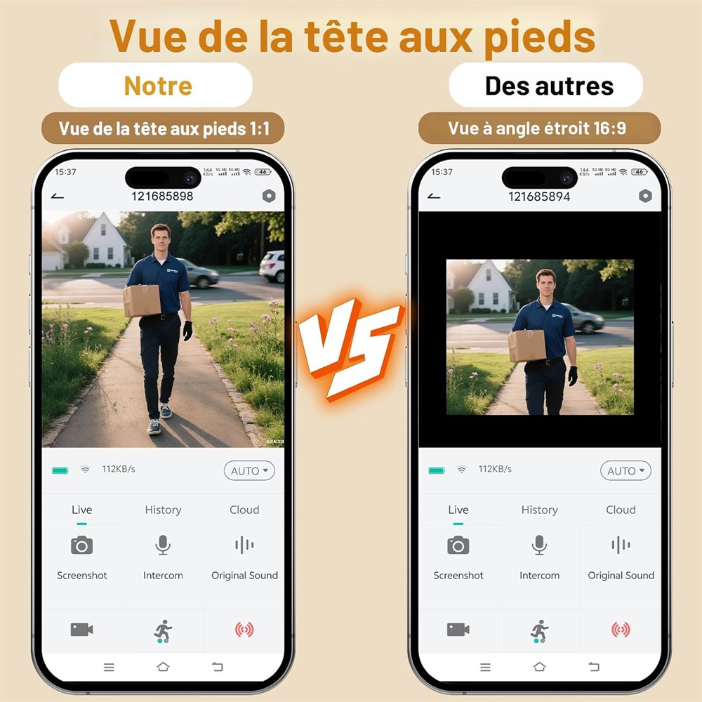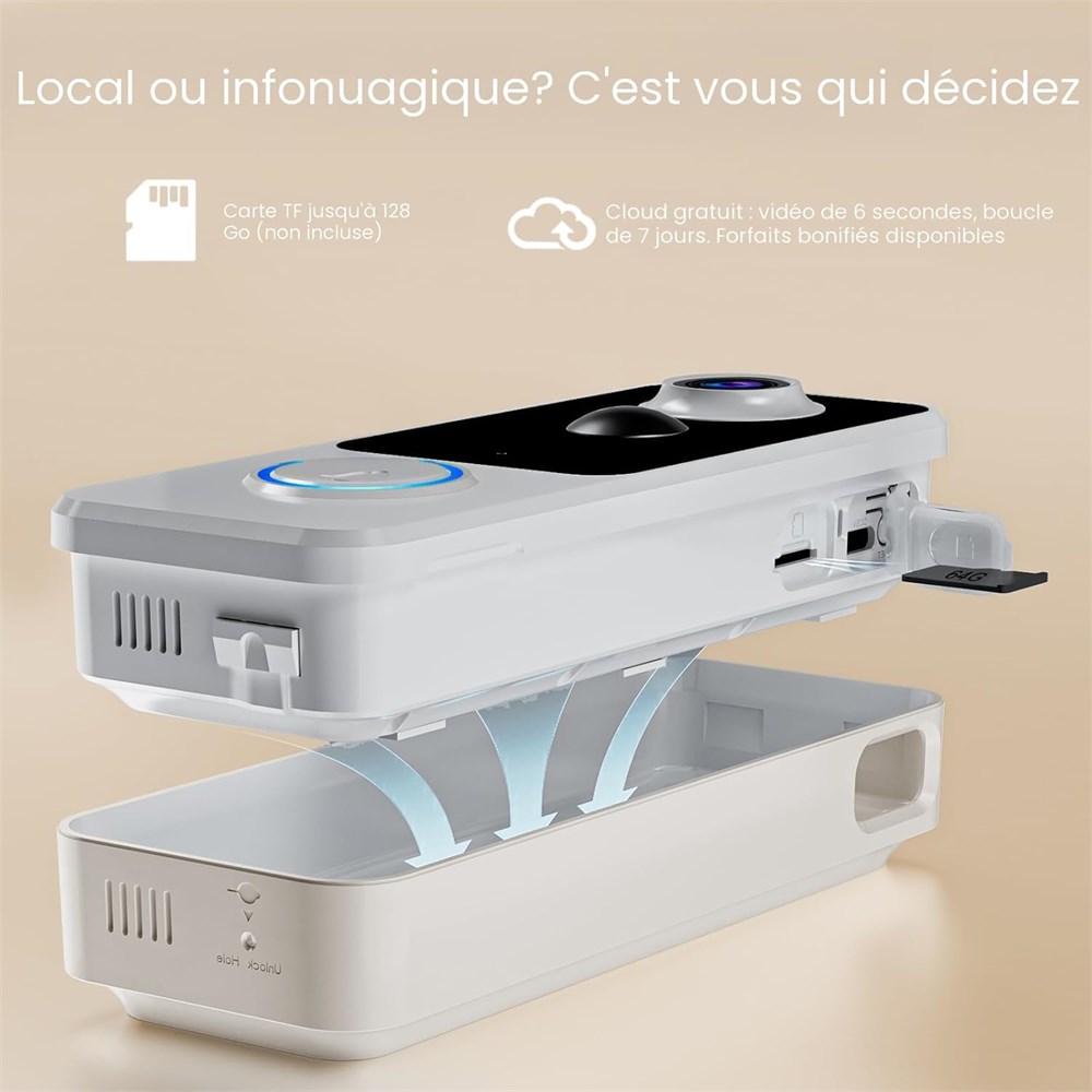 Sonnette vid o ultra-large de 180 de la t te aux pieds NOUVEAU mod le 2025 : vue du corps entier (un changement de donne!) Marre des sonneries cam ras plus anciennes qui ne capturent que le haut du corps? Notre toute nouvelle cam ra de sonnette sans fil 2025 r sout cela une fois pour toutes. Son objectif ultra grand-angle de 180 montre les visiteurs de la t te aux pieds avec des d tails cristallins - plus besoin de deviner s'ils portent un colis ou manquent la moiti de la sc ne. Voyez tout, du visage d'un livreur l'endroit o il a plac votre bo te sur le porche. Enfin, une cam ra de porte d'entr e qui couvre tout parfaite pour arr ter les voleurs de colis et savoir exactement qui est votre porte. Remarque : Fonctionne avec le Wi-Fi 2,4 GHz (5 GHz non pris en charge). Vision 2K HD jour et nuit Claire comme en plein jour, m me dans l'obscurit Notre sonnette de porte sans fil avec cam ra offre une r solution nette de 2K, vous permettant de zoomer sur les d tails comme les visages ou les plaques d'immatriculation. quip e d'une vision nocturne infrarouge de 10 m, elle surveille votre porte d'entr e comme un pro, m me dans l'obscurit totale. D tection intelligente des humains Plus d alertes fausses Cette sonnette vid o utilise une d tection de mouvement avanc e pour se concentrer uniquement sur les mouvements humains, r duisant de 90% les fausses alertes dues aux animaux domestiques, aux ombres ou aux arbres souffl s par le vent. Personnalisez les zones de d tection (par exemple, ne m'alertez que pour mon porche ) et la sensibilit via l'application. Restez inform de ce qui compte. Audio bidirectionnel + R ponses pr -enregistr es Communiquez en toute s curit avec les visiteurs en temps r el gr ce l'audio bidirectionnel, ou utilisez le changeur de voix pour plus d'intimit . Trop occup ? D clenchez des messages pr d finis comme Quittez le colis, je le r cup rerai plus tard ! Pas de petites conversations g nantes, juste une communication facile. Carillon int rieur blanc inclus Aucun achat suppl mentaire requis Aucun besoin d acheter des accessoires suppl mentaires ! Cette sonnette sans fil est livr e avec un carillon int rieur blanc dans le colis, de sorte que vous pouvez l'installer imm diatement. Que vous soyez dans le salon ou la chambre, le carillon vous alertera clairement lorsque quelqu'un est la porte - parfait pour l'associer votre sonnette vid o afin de garder votre maison connect e. Pas de frais d'abonnement + compatible Alexa et Google. Choisissez un stockage cloud gratuit vie (boucle de base de 6 s/7 jours, vous avez besoin d'enregistrements plus longs ? Passez des forfaits cloud payants pour plus de stockage.) ou ajoutez une carte TF de 128 Go (non incluse) aucun abonnement mensuel requis. Fonctionne avec Alexa et Google Assistant : dites simplement Montrez-moi la porte d'entr e pour voir les flux en direct. Cryptage niveau militaire + tanch it IP66 signifie qu'il r siste la pluie, la neige ou une chaleur de 38 C. Batterie rechargeable longue dur e Obtenez 1 2 mois par charge (l'application vous alerte 20 %). Aucune recharge constante cette sonnette de porte sans fil est con ue pour la commodit "installez-la et oubliez-la". Installation en 5 minutes Les locataires et propri taires l'adorent Les locataires : Utilisez le support adh sif (pas de per age, pas de dommages). Propri taires : fixez avec des vis pour une protection suppl mentaire contre le vol. S installe en quelques minutes aucun outil ni expertise requis. Notes cl s du produit pour l'installation et l'utilisation 1. 2 modes de stockage : choisissez le stockage local (retirez la coque arri re pr install e pour ins rer une carte m moire, carte non incluse) ou stockage cloud payant. 2. Chargement facile : d verrouillez l'unit principale avec le code PIN fourni pour l'emmener l'int rieur pour le chargement aucun d vissage ou d collage d'adh sif n cessaire. 3. R seau stable : installez dans votre zone de couverture Wi-Fi pour viter toute d connexion. 4. Alertes instantan es : activez les notifications pop-up dans les param tres de votre t l phone pour recevoir des alertes de sonnerie via l'application. 5. Conseils de montage : utilisez les vis fournies ou l'adh sif ; s lectionnez le bon outil en fonction de votre surface murale pour une installation s re.