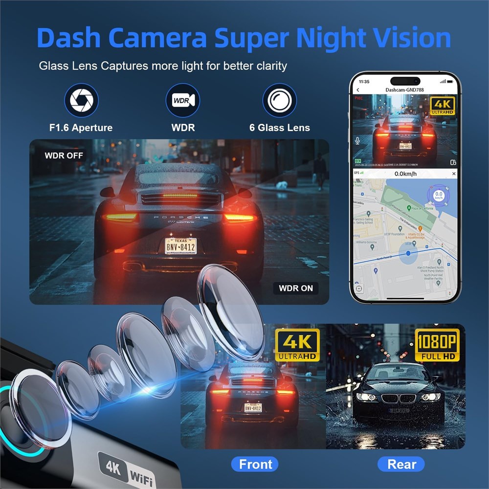MINI DASH CAM - Hidden mount design is easier to hide behind the rearview mirror without obstructing your view. The dash cam front 4K + rear 1080P allows for HD recording, eliminates motion blur, and captures crisp details during the day and night for important evidence in disputes or claims. WIDE ANGLE RECORD - Aprilboy Car Camera comes with 170 wide angle front camera and 360 rear camera, you can have a clear view of the front&inside&rear of your car from any angle, providing all-around protection for a wide range of vehicles such as cars, SUVs, Jeeps and trucks. EXCELLENT PERFORMANCE - The body of the dash cam is made of aircraft-grade aluminum alloy, equipped with IOS light sensor and HDR/WDR image technology, the camera features an F1.6 aperture and a 6 layer glass lens, which can quickly capture details and restore the real scene to minimize disputes regardless of bright light, rainy days and nighttime environments. APP CONTROL - The dash camera has built-in 5.8G WiFi, and with the free app Viidure , you can easily view, playback and manage the dashboard camera on your IOS or Android device. The videos can be shared to YouTube, Twitter, Facebook or social media platforms according to your preference to share the excitement of your journey with your friends and family. G-sensor - When the dashcam detects a collision, the gravity sensor automatically records and locks on to the protected video for the 45 seconds of the motion detection. The loop recording feature overwrites old unprotected files when the SD card is nearly full.