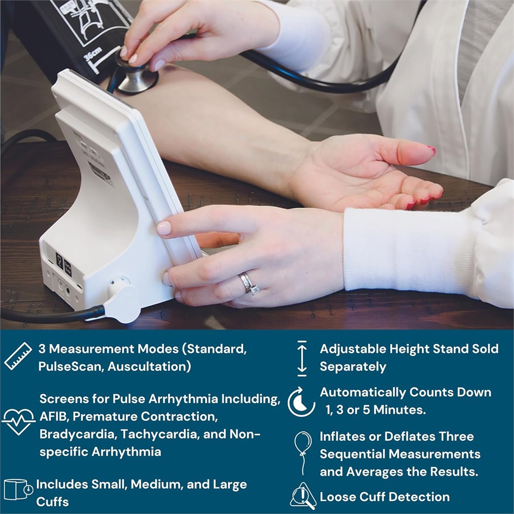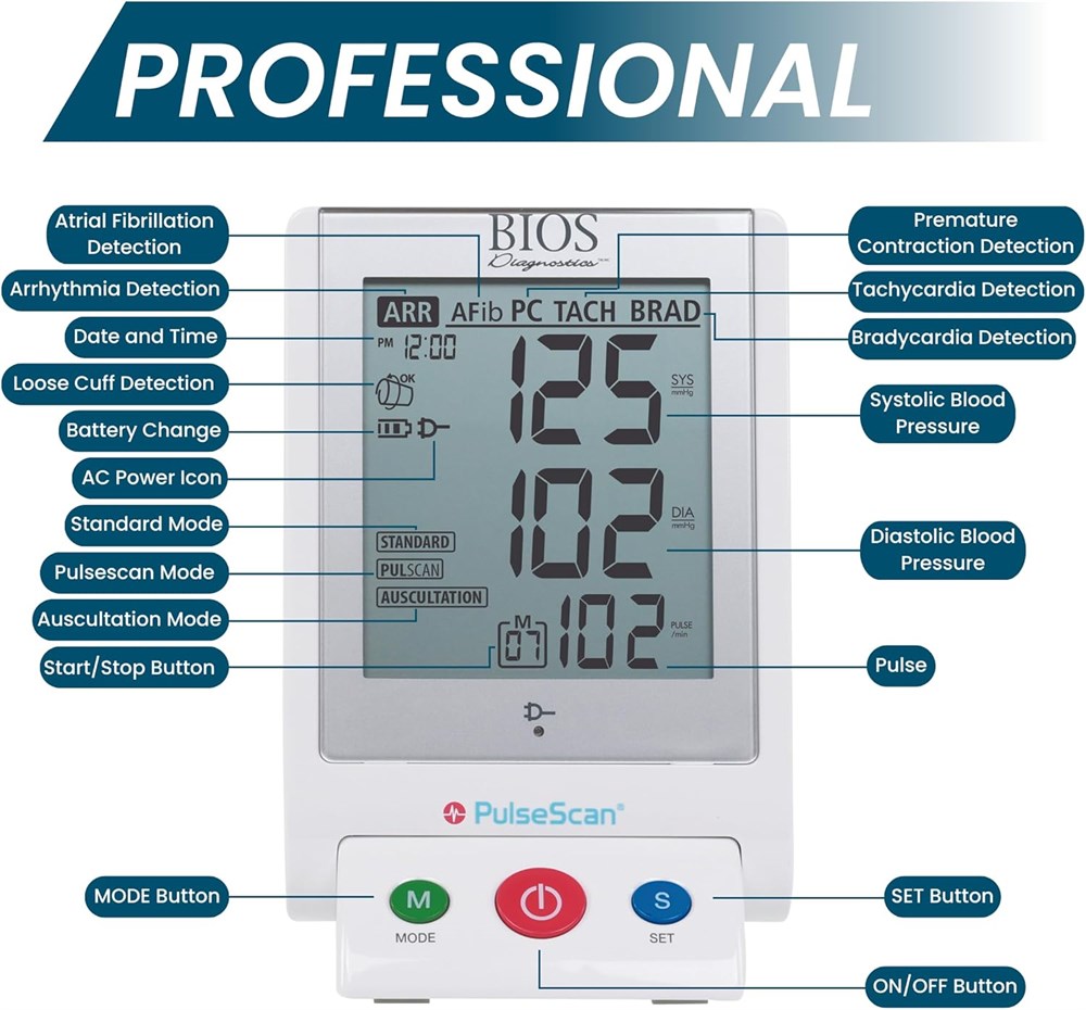 *BIOS Medical is the #1 Canadian Blood Pressure Manufacturer, according to 2021-2022 Nielsens Sales Data for Thermor Ltd. BIOS Medical is a brand by Thermor Ltd. Recommended by Hypertension Canada and Licensed by Health Canada Screens for pulse arrhythmia including: afib, premature contraction, bradycardia, tachycardia, non-specific arrhythmia 3 cuff sizes: small: 16-26 cm; medium: 24-36 cm; large: 34-46 cm Automatic averaging 3 measurement modes Designed for professional office use*