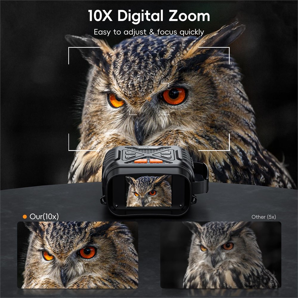 Clearly See in Complete Darkness This HD infrared night vision goggles is equipped with a 7-level adjustable infrared illuminator and a 2.8-inch HD display screen that allows you to get a clear observation view even in low lights or no external light; Perfect for outdoor activities, security and surveillance, camping, watching wildlife and scenery Dual Use Day & Night Not only night vision goggles but also binoculars, please turn off IR during the day and turn on IR when using it at night; Manual focus, easy to use; The night vision binoculars can take photos, and record videos, and playback, you can capture high-definition photos & videos at any time 10X Digital Zoom You can easily get more details of your surroundings with the powerful digital 10X zoom feature; The 2000mAh rechargeable battery, allows you to view animals or other objects for hours; The unique elastic nylon strap design on the side of the night vision camera makes it easier to hold. In addition, there is a tripod hole at the bottom Support Connect with PC The binoculars for adults can be connected to a computer via the USB cable to obtain a large view; Support Windows Vista/XP/7/8/10/11, MacOS X 11.0 or higher, but not available for Apple laptops with Type-C interface A Perfect Gift Choice What You Will Get: 1x Night Vision Goggles, 1x 32GB TF Card, 1x Data Cable, 1x Neck Strap, 1x User Manual; Note: The memory card is in the card slot; It is also a good choice to give it to family, friends, and children as birthday or holiday gifts.