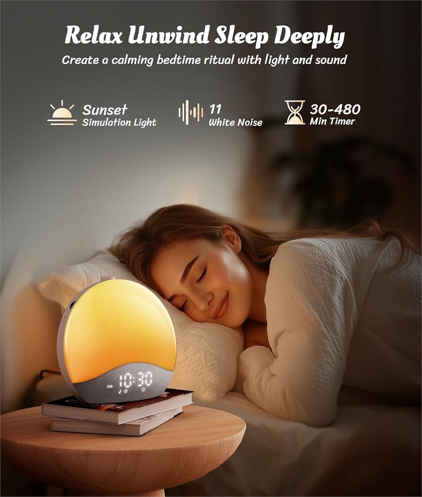 Laissez le lever du soleil avec vous : personnalisez votre heure de r veil avec la lumi re apaisante d'un lever de soleil. Commencez votre journ e d tendu et revitalis , au lieu de vous r veiller brusquement avec un son fort. M me en cas de panne de courant, la batterie m moire int gr e enregistre vos param tres 26 sons apaisants, relaxation sans fin : Du son apaisant de la pluie au bruit blanc, cr ez un environnement de sommeil paisible qui vous aide vous d tendre et plonger dans un sommeil profond et ininterrompu. Aucune application requise pour l'utilisation Con u pour votre commodit : les boutons r tro clair s facilitent les r glages nocturnes, que vous r gliez l'alarme ou la lumi re, c'est rapide et facile, m me lorsque vous tes groggy ou moiti veill Configuration en quelques secondes : En seulement quatre tapes, vous serez pr t profiter de votre routine de r veil parfaite. Branchez, r glez l'heure, ajustez l'alarme et personnalisez votre clairage. Rapide, simple et pr t l'emploi Trouvez votre lumi re parfaite : d une douce veilleuse une lampe de lecture chaleureuse, ajustez la luminosit et la couleur pour cr er l ambiance parfaite. Choisissez parmi 17 couleurs pour correspondre votre humeur et au style de votre pi ce Connectez-vous et profitez : connectez votre t l phone via Bluetooth et profitez d'une qualit sonore sup rieure gr ce deux haut-parleurs. Que ce soit votre chanson pr f r e ou des sons apaisants pour le sommeil, chaque note est d une clart cristalline.