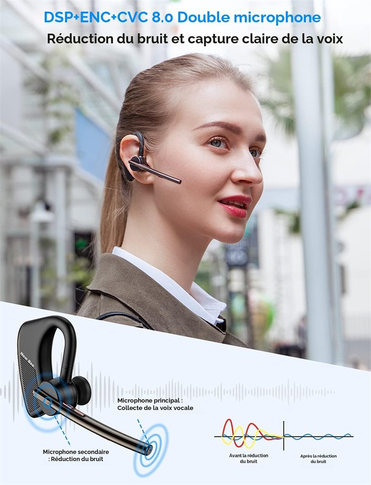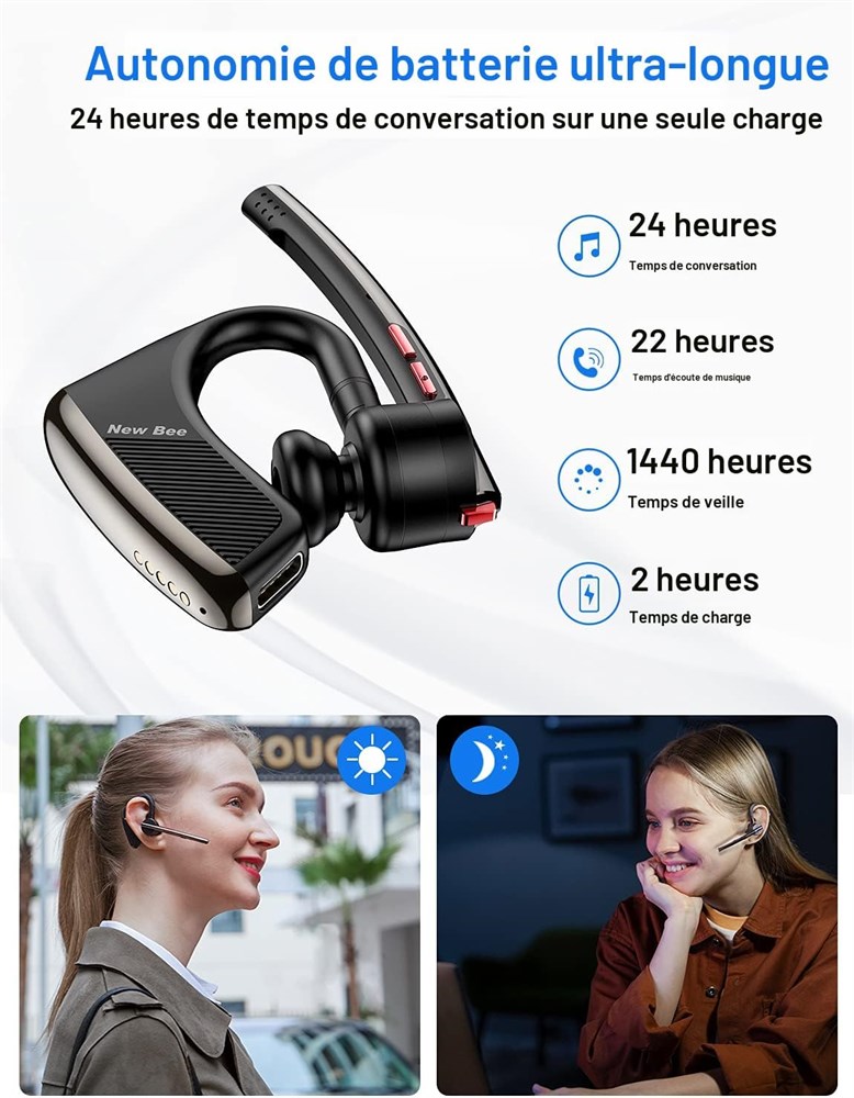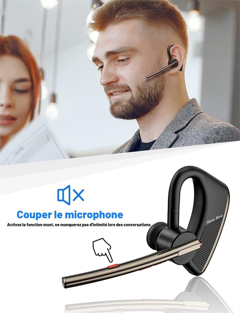 Microphone double et fonction de suppression du bruit et de muet : Le casque sans fil New Bee avec r duction du bruit d'appel CVC8.0 ENC peut identifier avec pr cision les voix humaines et prot ger des bruits de fond tels que le vent et le bruit de la circulation pour vous offrir des appels de qualit sonore HD. Il est n cessaire d'utiliser la sourdine comme courtoisie lorsque vous avez besoin de tousser ou d' ternuer. Parfois, en particulier avec des informations sensibles ou difficiles, vous pouvez utiliser la fonction muet pour demander rapidement conseil un coll gue Excellente autonomie : Le casque t l phonique Bluetooth New Bee M50 peut offrir 24 heures de temps de conversation ininterrompu, 20 heures de temps d coute de musique continue et 1440 heures de temps de veille. Vous offre une qualit d'appel HD long terme. Technologie Bluetooth 5.2 : le casque sans fil Bluetooth V5.2 vous offre une connexion stable faible latence, compatible avec tous les smartphones iOS et Android, y compris iPhone, iPad, Samsung, Sony, Motorola, LG, ordinateur portable et autres. Connectez-vous instantan ment votre smartphone ou tablette jusqu' 15 m tres de distance. Design confortable et pratique : casque mains libres M50 con u pour s'adapter chaque oreille. Le crochet d'oreille rotatif 270 et le bras articul rabattable pour un ajustement confortable. Il est l ger (16 g) et assez confortable pour tre port pendant des heures la fois. Le bo tier de transport permet de garder l'oreillette ultral g re en s curit et facilite le transport. Connectez 2 appareils : jumeler deux t l phones rapidement et facilement et r pondre aux appels de l'un ou l'autre. L'oreillette sans fil est compatible avec tous les smartphones iOS et Android. Livr avec une oreillette Bluetooth mono-oreille avec microphone, 3 paires de embouts, un c ble USB C et un guide d'utilisation pour vous.