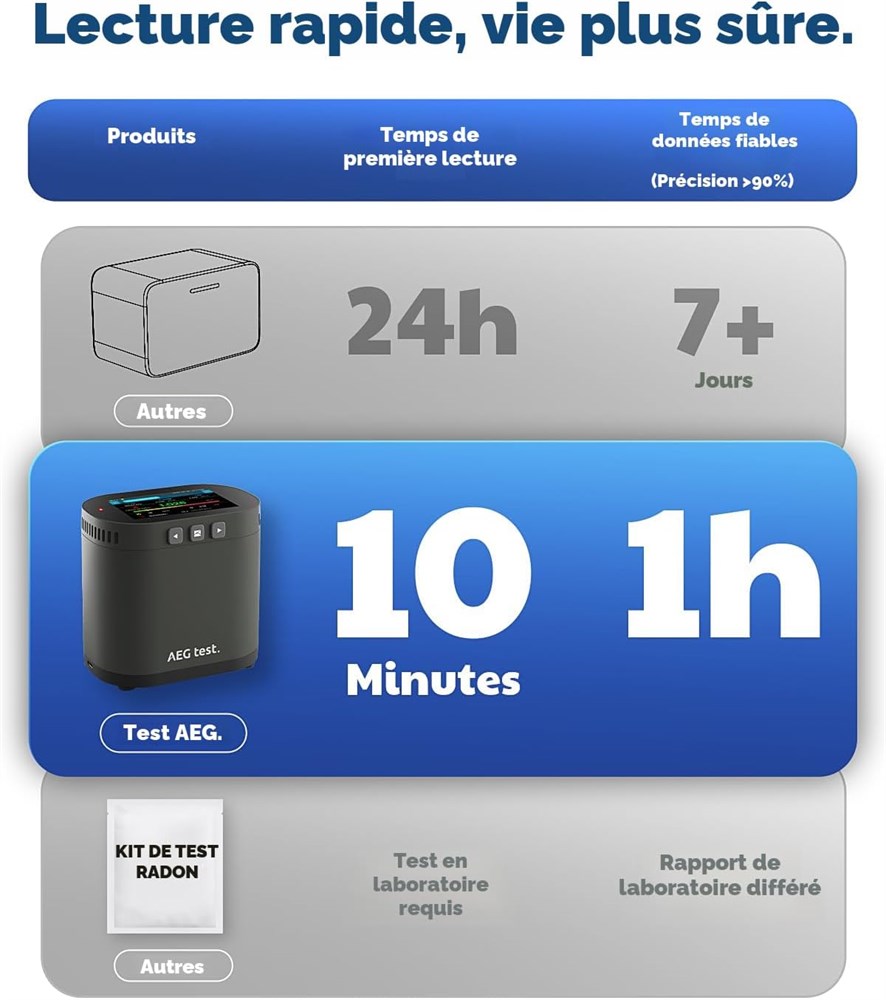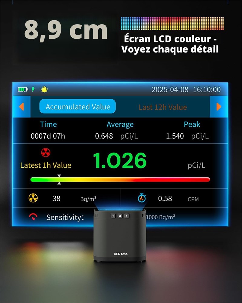 Gardez une longueur d'avance sur chaque changement : le HOUND-3786 utilise une chambre d'ionisation puls e haute sensibilit pour une d tection rapide et pr cise des niveaux de radon en fluctuation constante premi re lecture en 10 minutes, donn es stables en 1 heure et mises jour automatiques toutes les 10 minutes Suivi court et long terme : fournit un aper u complet des donn es avec des graphiques int gr s directement sur l'appareil. Stocke plus d'un an et demi d'historique et vous permet d'exporter facilement des rapports PDF sur votre t l phone ou votre ordinateur, aucune application ou laboratoire n'est n cessaire Design convivial : voir plus en un coup d' il sur le grand cran LCD couleur de 3,5". Avec des boutons de commande intuitifs et une batterie rechargeable, le HOUND-3786 est id al pour une utilisation quotidienne long terme la maison, au sous-sol ou au bureau Plusieurs modes d'alerte : les barres code couleur affichent intuitivement les niveaux de radon, les indicateurs LED clignotants combin s des alarmes sonores personnalisables fournissent des avertissements en temps r el pour prot ger la sant de votre famille Ensemble pr t l'emploi : comprend 1 d tecteur de radon HOUND-3786, 1 c ble de donn es de charge et 1 manuel d'utilisation multilingue. Pr t l'emploi d s la sortie de la bo te avec une utilisation simple.