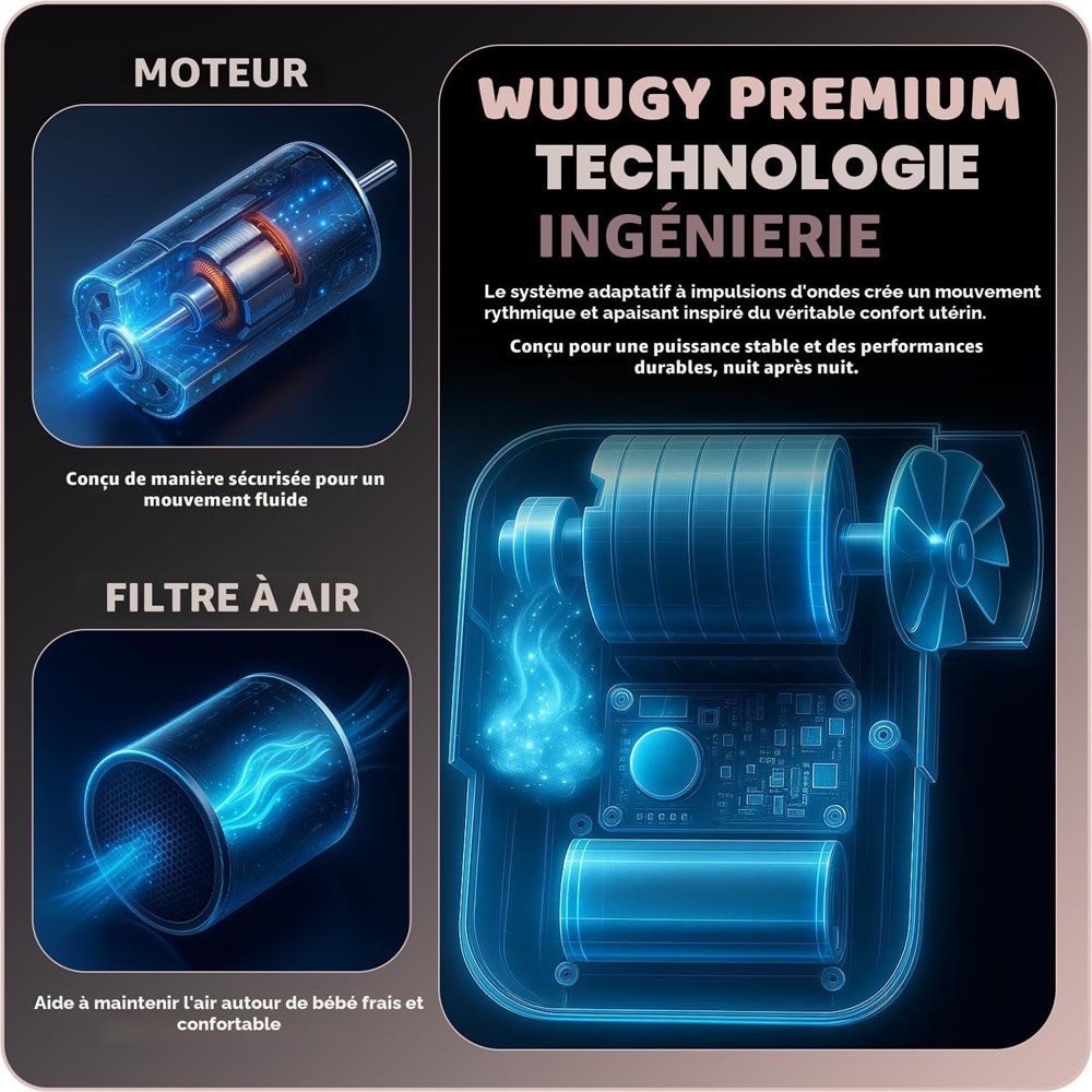 Vibration apaisante semblable un trajet en voiture recr e le rythme doux que les b b s prouvent souvent en mouvement, les aidant s'installer plus facilement et se sentir en s curit . Bruit blanc naturel + 5 m lodies apaisantes : un ensemble sonore cr pour promouvoir un environnement calme et encourager un sommeil plus long et plus r parateur. Micro filtre air pour un flux d'air plus frais. Le filtre air micro charbon actif int gr est con u pour aider minimiser la poussi re et les petites particules autour de votre b b pendant les siestes et le repos nocturne. Ajustement universel et fixation facile - Se fixe en toute s curit la plupart des berceaux, berceaux et poussettes en quelques secondes avec un simple m canisme de verrouillage rotatif. Confort doux pendant les moments difficiles Les vibrations puls es sont con ues pour fournir un confort doux pendant les p riodes d'agitation. Autonomie de la batterie toute la nuit : la batterie rechargeable durable prend en charge les siestes prolong es, l'utilisation nocturne et les voyages. Design d pos | Le design unique et soigneusement con u fait de Wuugy un appareil distinctif apaisant pour b b . Couverture de garantie limit e de 2 ans contre les d fauts de fabrication et de mat riau.