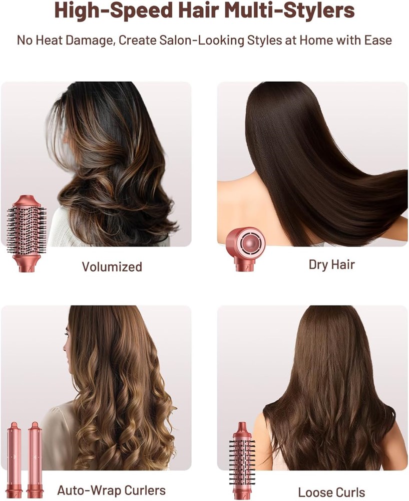 KINDLY REMINDER: If you are not clear how to install the air styler, the installation on the detail page will be a great help Achieve Versatile Styling In One: Get various salon-worthy looks at home with our 5-IN-1 Air Styler Kit! The auto wrap hair styler includes 5 interchangeable attachments (high-speed hair dryer, left & right auto wrap curling irons, oval hair brush, round brush) for drying, curling, volumizing, and straightening. This hair styler is ideal for all hair types and meets your various styling needs Quick Styling Air Styler: The air curler for hair with 110,000 RPM high-speed brushless motor, and powerful airflow up to 23m/s can accelerate drying, shortening your time by half that of traditional hair dryers. From blow drying to creating bouncy curls, the hair styler only takes a dozen minutes, saving your styling time every morning No Heat Damage Hair Styler: Fast drying your hair while maintaining low heat, rather than getting hotter as it runs, this air styler set with intelligent thermal control can automatically detect the air temperature, thus controlling it below 248 F, minimizing heat exposure & regulating temperatures, avoiding irreversible heat damage to your hair FRIZZ-FREE Hair Dryer Brush: The professional 5 in 1 air styler with 30 million negative ions 10X more than standard dryers! This upgrade boosts your hair shine greatly, frizz-free. The premium dual nylon-tufted brush head glides through knots without hair snagging or breakage, bringing a smooth and sleek finish. Whether you re blow-drying or curling, this 5 in 1 high-speed hot air styler delivers salon-quality smoothness with zero hassle Portable & Gift-Perfect Design: Take your styling routine anywhere with the included high-quality and exquisite storage bag. Our hair styler kit keeps all attachments organized no more lost brushes or tangled cords. Just go with it! And the unique fashion color makes the air styler set also perfect as a birthday or festival gift to your girlfriend, mother, or daughter.