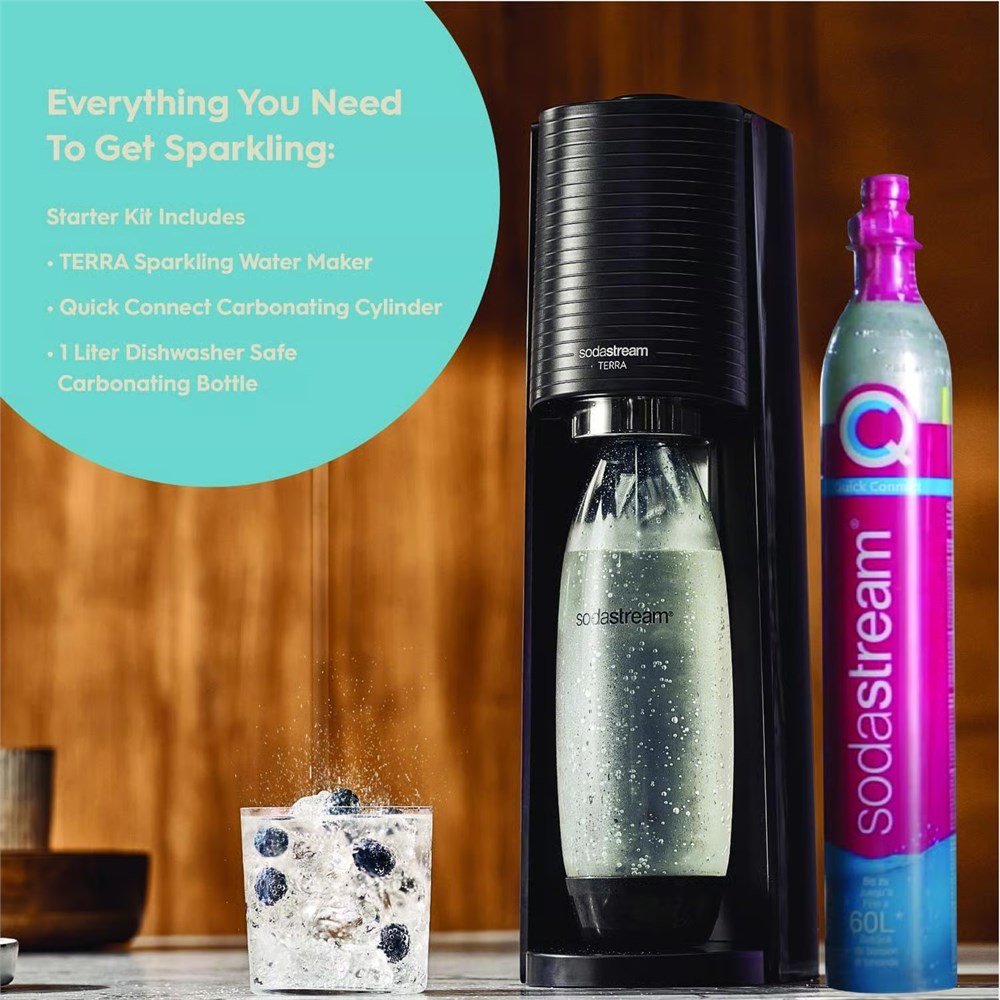 Introducing the Terra Machine Starter Kit, SodaStream's newest Sparkling Water Maker. The Terra Sparkling Water Maker turns plain water into fresh sparkling water in seconds and is designed for the modern kitchen. Featuring new Quick Connect technology for fast and easy CO2 cylinder insertion. The improved design features an elegant matte finish, updated slim silhouette, improved ergonomics, a dishwasher safe carbonating bottle and Quick Connect CO2 cylinder technology. Manual carbonation, no batteries required. One SodaStream reusable carbonating bottle can save up to thousands of single use plastic bottles.