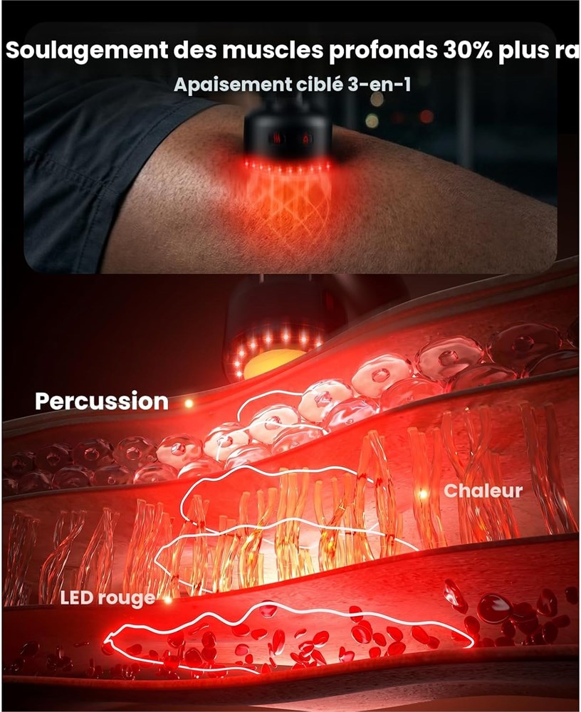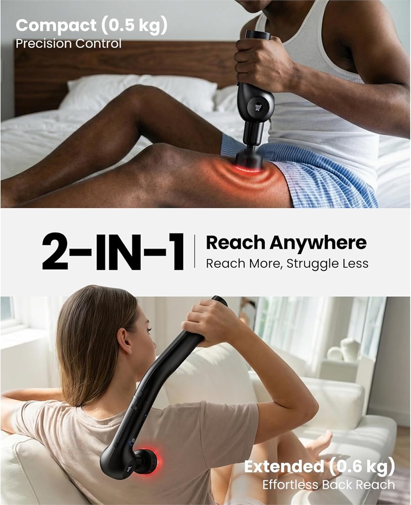 Design 2 en 1 : retrouvez votre ind pendance avec un design polyvalent qui s'adapte vos besoins. Utilisez le mode portable compact pour un contr le pr cis sur les bras et les jambes, ou fixez la poign e d'extension Quick-Lock (ajoute 20 cm) pour cibler facilement les zones difficiles d'acc s comme le milieu du dos et l'omoplate. Combin avec une t te rotative de 90 180 , ce design ergonomique vous permet d'apaiser votre dos sans compter sur les autres pour l'aide. Technologie apaisante triple action : am liorez votre routine de relaxation quotidienne avec notre accessoire sp cialis chaleur et infrarouge . Cette unit combine des percussions avec un chauffage rapide (jusqu' 45 C) et des LED rouges int gr es pour fournir une exp rience profond ment apaisante. La chaleur aide liminer l'inconfort musculaire apr s une longue journ e de travail ou d'exercice, favorisant la relaxation plus rapide que les vibrations seules. Remarque : l'accessoire chauffant dispose d'une source d'alimentation ind pendante pour garantir une chaleur constante et fiable pendant l'utilisation. Puissance personnalisable et silencieux : con u avec un moteur sans balais couple lev , cet appareil offre une force de d crochage calibr e de 11 kg avec 5 vitesses r glables (jusqu' 3000 tr/min). Il offre l' quilibre parfait : assez solide pour d tendre les tissus profonds mais assez doux pour les zones sensibles comme le dos et les paules. Gr ce la technologie ultra-silencieuse (< 55 dB), vous pouvez profiter d'une exp rience de massage tranquille la maison, au bureau ou la salle de sport sans d ranger votre entourage. Facile utiliser et contr le antid rapant : con u pour un fonctionnement sans frustration, ce masseur dispose de boutons physiques intuitifs sur le c t , emp chant les commutateurs de mode accidentels communs avec les crans tactiles. La poign e est finie avec une texture g om trique antid rapante pour une prise en main s re. Aliment par une batterie de qualit sup rieure de 2600 mAh avec charge rapide Type-C PD (compl tement charg e en 2,5 heures), il comprend galement une minuterie d'arr t automatique de 10 minutes pour garantir des sessions d'utilisation s res et optimales. Coffret cadeau id al pour se d tendre : dans un tui de voyage rigide de qualit sup rieure, cet ensemble comprend un appareil de massage, une poign e d'extension et 5 accessoires sp cialis s pour une relaxation compl te du corps. C'est une id e de cadeau attentionn e pour les parents, les partenaires ou les amateurs de fitness pour les anniversaires et les vacances. Nous soutenons la qualit de nos produits avec une garantie de 2 ans et un soutien d di , vous donnant la tranquillit d'esprit lors de votre achat.