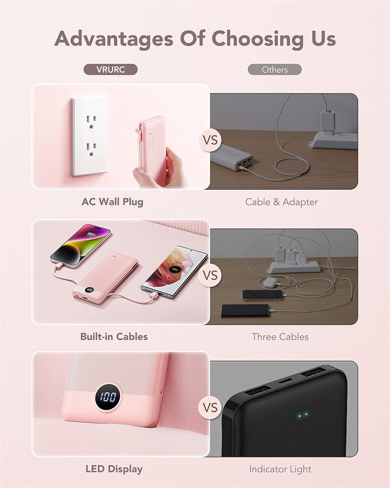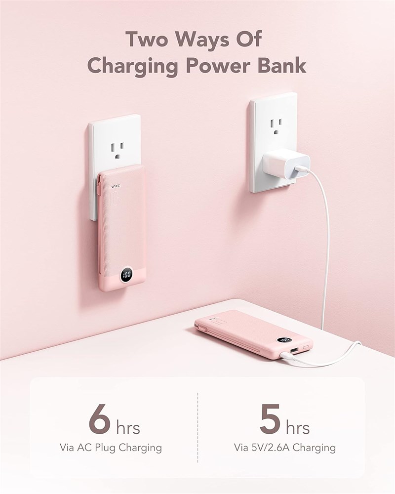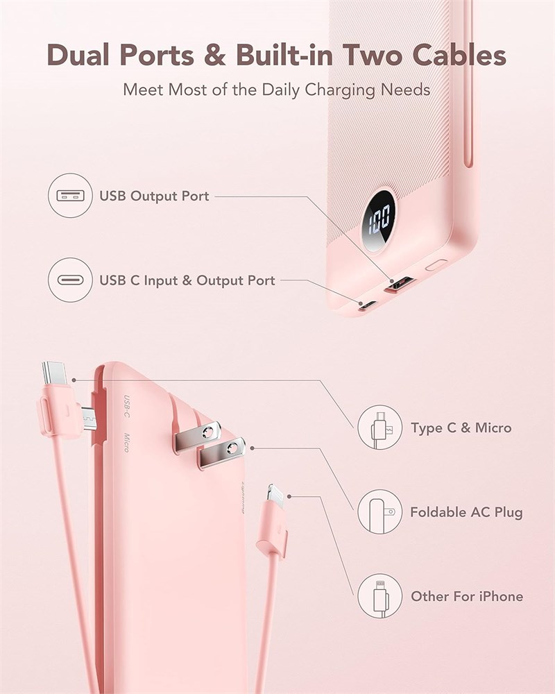 Portable Charger With Built-in Charging Cables and Ports This USB C portable charger not only has a built-in micro cable, type C cable, and other data cables, but also is equipped with a USB input port, Type-C input, and output ports. Using the built-in cables to charge, the portable battery charger is compatible with iPhone, Android devices, and USB-C most mobile phones and smart devices. This external battery power bank can meet most of the charging needs of daily life. Portable Charger With Built-in AC Wall Plug Portable phone charger with built-in AC Wall Plug can charge the power bank itself directly from the wall outlet. You don't worry about forgetting to carry your cable and adapter, It's ready for you all the time. Lightweight Compact Design Product dimension is 5.9 x 2.8 x 0.7 in, weighing only 8 Oz, this portable power bank adopts a compact and ultra-light design, which's convenient to carry around without adding too much weight for you. Two Way To Charge The Power Bank One is charging the power bank through the AC wall plug, it will be fully charged within 6 hours. The other is using the 5V/2.6A charging cable to charge the power bank itself, it will be fully charged within 5 hours. Safety Charging The 10000mah power bank built in wall plug uses high-quality smart chip, which will protect your device from overcharge, overcurrent, overvoltage, and short-circuit, creating a safe charging experience for you. * PRODUCT PACKAGE: 1x Power Bank, 1x User Manual.