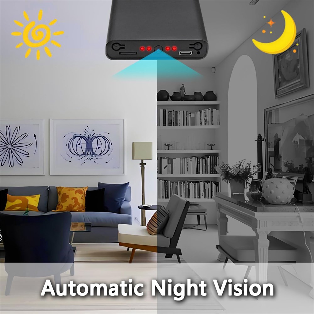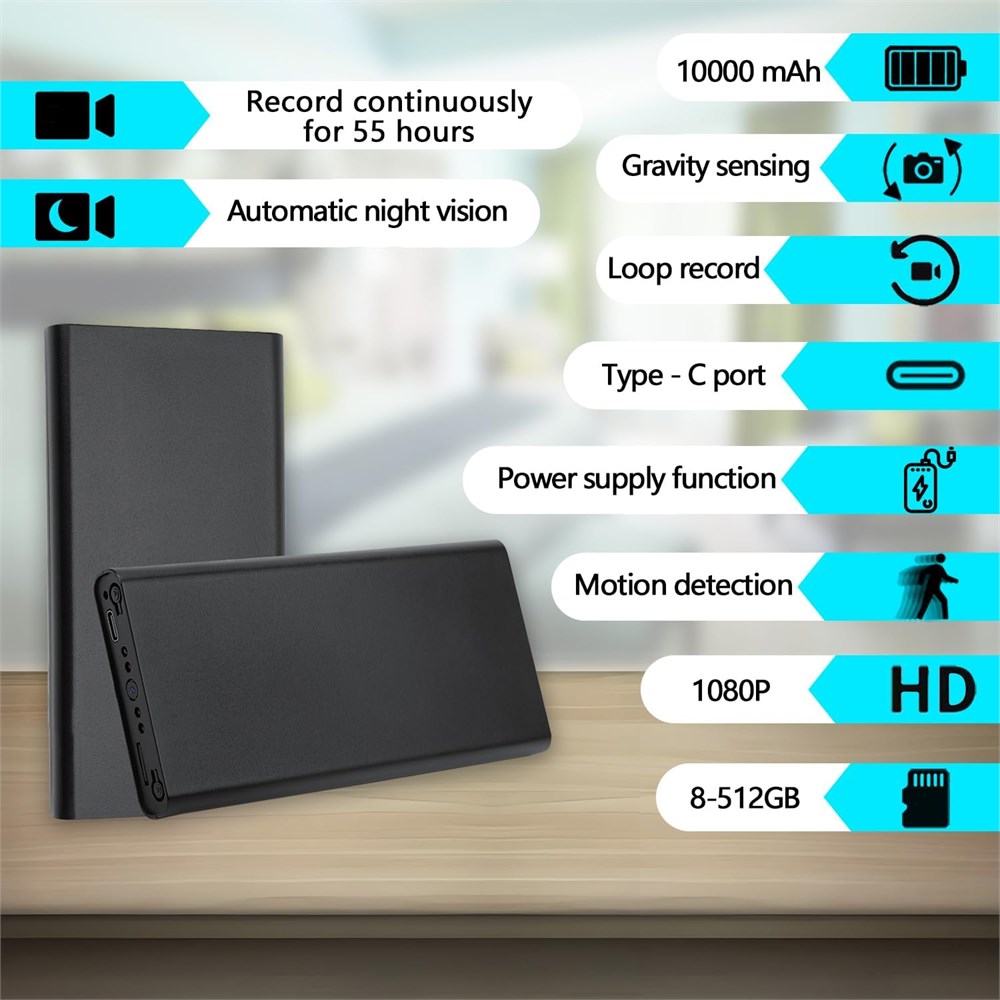 Multifunctional Shooting - Photo shooting - Power supply for electronic devices - Motion detection - Loop record - Automatic night vision function - Gravity sensing - Time watermark setting - Small size, light weight, easy to carry, and multiple uses when you are out and about. No matter where you put it, it will not be very conspicuous. Except for this setup that cannot connect to any network or Bluetooth, it can work easily wherever you put it. Gravity Sensor During the operation, when the camera is flipped 180 degrees up and down, it will automatically switch to the normal image. Even if the camera is placed casually, an upright image can be obtained. When the camera is just started, it is recommended to first flip the camera 180 degrees up and down to activate the gravity sensor. Otherwise, the recorded screen may be reversed. 55-Hour Video Record & 512GB Large Capacity This camera is equipped with a built-in 10,000mAh battery, capable of continuously record videos for 55 hours. A single charge ensures all-day security. Supporting memory cards from 8GB to 512GB (storage card not included, needs to be purchased separately), it enables long-term video record. Whether during work or sleep, it helps identify individuals with suspicious behaviors. Motion Detection Function This camera is equipped with the latest motion detection technology. When it is set to the motion detection video record mode, as long as there is motion within the shooting range, the camera will automatically record videos. In this way, the camera can record for a longer time, save storage space, and not miss important moments. 1080P Clarity and Night Vision Auto Switching This camera has a true 1920 x 1080 pixels with a video frame rate of 30 fps. it captures beautiful high resolution video. This infrared night vision camera is equipped with 4 x 940nm high efficiency infrared lamps. It automatically activates the night vision function in dark environments, providing a clear view even in the dark. It is safe and reliable, perfect for home and office security measures.